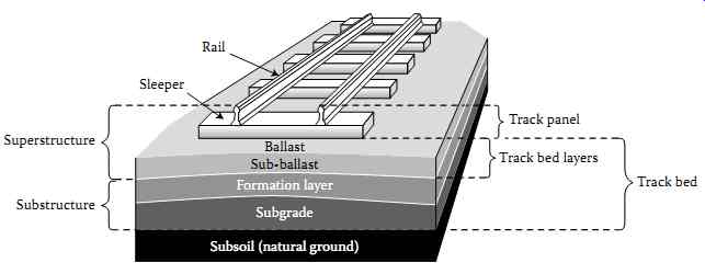 การสร้างทางรถไฟเริ่มต้นจากพื้นดินเดิม (Subsoil) ที่ถูกยกพื้นให้สูงขึ้นด้วยวัสดุที่รองรับโครงสร้างของระบบการปูผิวหน้า โดยจะยกให้สูงขึ้นในระดับที่จะไม่เกิดน้ำท่วม ด้านบนของพื้นที่ถูกยกสูงขึ้นนั้นจะถูกปูด้วยหินโรยทางรถไฟก่อนที่จะมีการติดตั้งรางรถไฟและหมอนรองรางรถไฟเข้าด้วยกัน จากนั้นจึงจะเทกลบด้วยหินโรยทางอีกครั้ง หินที่มีลักษณะขอบไม่เรียบจะช่วยยึดรางรถไฟไว้ในตำแหน่งที่มีการคำนวณอย่างแม่นยำแล้วทางวิศวกรรมระบบราง
