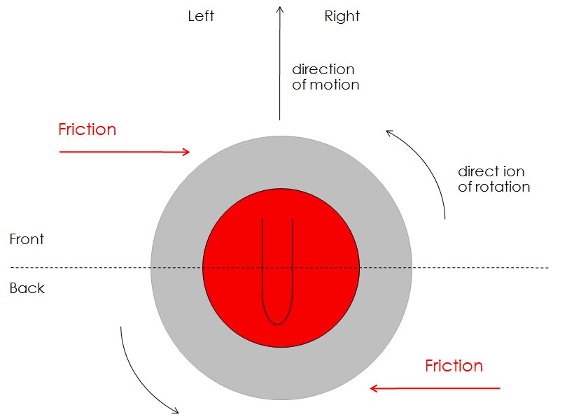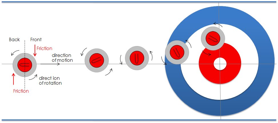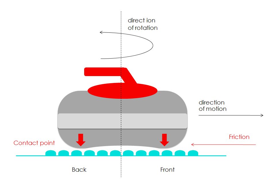 แม้ว่าพื้นผิวของน้ำแข็งจะลื่น แต่ก็ยังคงมีแรงเสียดทานที่ช่วยชะลอการเคลื่อนที่ของก้อนหินให้ช้าลง ซึ่งส่งผลให้ทิศทางเคลื่อนที่ของก้อนหินเบี่ยงเบนจากการเคลื่อนที่ในแนวตรงเป็นการเคลื่อนที่แบบการหมุน โดยก้อนหินหรือสโตนที่หมุนทวนเข็มนาฬิกา ในส่วนครึ่งด้านหน้าของสโตน ทิศทางการเคลื่อนที่จะหมุนไปทางด้านซ้าย และมีแรงเสียดทานมากระทำต่อวัตถุในทิศทางตรงข้าม ในขณะที่ส่วนครึ่งด้านหลังของสโตน ทิศทางการเคลื่อนที่จะหมุนไปทางด้านขวา ดังนั้นแรงเสียดทานที่กระทำต่อวัตถุหรือก้อนหินจึงอยู่ทางด้านซ้าย สิ่งสำคัญอยู่ที่ขนาดของแรงเสียดทานที่กระทำต่อวัตถุทั้งในส่วนของครึ่งหน้าและครึ่งหลังนั้นจะมีขนาดไม่เท่ากัน นั่นเกิดจากส่วนของครึ่งแรกของก้อนหินที่ถูกผลักจากผู้เล่นและออกตัวก่อน จะมีแรงเสียดทานกระทำมากกว่าส่วนของครึ่งหลังของก้อนหิน และข้อมูลที่น่าสนใจนี้ทำให้ผู้เล่นสามารถควบคุมการหมุนของก้อนหิน เพื่อให้เกิดแรงเสียดทานที่พาก้อนหินออกจากจุดเริ่มต้นไปยังเป้าหมายได้ อย่างไรก็ดีนอกจากการควบคุมการหมุนของก้อนหินแล้ว ผู้เล่นยังต้องควบคุมขนาดของแรงเสียดทานบนพื้นผิวน้ำแข็งด้วย
