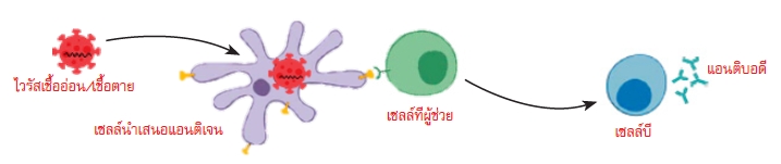 เชื้อจากวัคซีนที่เข้าสู่ร่างกายจะไปกระตุ้นเซลล์นำเสนอแอนติเจน ทำให้มีการสร้างเซลล์ที่ผู้ช่วย (Helper T Cell) เพื่อจดจำเชื้อหรือแอนติเจนนี้ แล้วกระตุ้นเซลล์บี (B Cell) ให้มีการสร้างแอนติบอดีที่จำเพาะต่อเชื้อ SARS-CoV-2 (Van Oirschot, 2001)