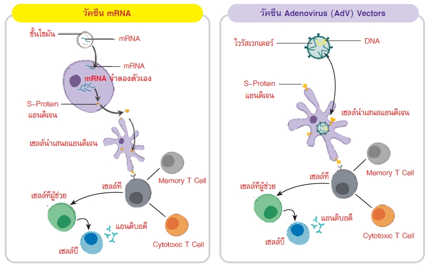 วัคซีน mRNA และวัคซีน Adenovirus (AdV) Vectors เมื่อเข้าสู่ร่างกายจะมีกลไกกระตุ้นระบบภูมิคุ้มกันแบบเดียวกันแต่ตัวรับในร่างกาย (Toll-Like Receptor) ที่จับกับแอนติเจนแตกต่างกัน โดยวัคซีน mRNA มีตัวรับเป็น Toll-Like Receptor 7 (TLR7) และ MDA5 ส่วนวัคซีน Adenovirus (AdV) Vectors มีตัวรับเป็น Toll-Like Receptor 9 (TLR9) แล้วกระตุ้นการสร้าง S-Protein (โปรตีนมือเกาะของไวรัส ซึ่งเป็นแอนติเจนรูปแบบหนึ่งขึ้นมา ทำให้เซลล์นำเสนอแอนติเจนมีการกระตุ้นเซลล์ที่ (T Cell) ให้สร้างเซลล์เม็ดเลือดขาวชนิด Memory T Cell และชนิด Cytotoxic T Cell ทำหน้าที่จดจำเชื้อและทำลายเซลล์ที่ติดเชื้อโรค ตามลำดับ ในขณะเดียวกันเซลล์ที่จะกระตุ้นเซลล์ที่ผู้ช่วย (Helper T Cell) ให้กระตุ้นการสร้างเซลล์บี (B Cel) เพื่อสร้างแอนติบอดีที่จำเพาะต่อเชื้อ SARS-CoV-2 และสร้างเซลล์ที่ทำหน้าที่จดจำ (Memory B Cell) เชื้อนั้นไว้ (Teijaro and Farber, 2021)