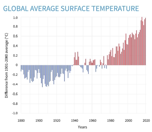 โลกของเรากำลังเปลี่ยนแปลง วลีนี้คงไม่ใช่เรื่องที่ไกลตัวอีกต่อไป National Oceanic and Atmospheric Administration หรือ NOAA หน่วยงานด้านการพยากรณ์การเปลี่ยนแปลงภูมิอากาศ มหาสมุทร และชายฝั่งทะเล ได้มีการเก็บข้อมูลอย่างต่อเนื่องและเผยแพร่ข้อมูลการเปลี่ยนแปลงภูมิอากาศที่มีผลกระทบต่อโลกของเรา อ้างอิงจากเว็บไซต์ https://www.noaa.gov/education/resource-collections/climate/climate-change-impacts พบว่าจากปี ค.ศ.1901 - 2020 อุณหภูมิเฉลี่ยของโลกสูงขึ้นประมาณ 1oC (ภาพ 1) ซึ่งเป็นการเปรียบเทียบความแตกต่างของอุณหภูมิพื้นผิวเฉลี่ยของโลกตั้งแต่ปี ค.ศ. 1880 - 2020 กราฟแท่งสีฟ้าแสดงอุณหภูมิที่เย็นกว่าค่าเฉลี่ย ส่วนสีแดงแสดงอุณหภูมิที่ร้อนกว่าค่าเฉลี่ย จะเห็นว่าการเปลี่ยนแปลงอุณหภูมิพื้นผิวเฉลี่ยของโลก มีแนวโน้มสูงขึ้นอย่างต่อเนื่อง เป็นส่วนหนึ่งที่เร่งให้ปริมาณคาร์บอนไดออกไซด์ในชั้นบรรยากาศสูงขึ้น ซึ่งมีผลต่อการเกิดปรากฏการณ์เรือนกระจกตามธรรมชาติ ทำให้เกิดการสะสมความร้อนในชั้นบรรยากาศของโลก ส่งผลให้โลกของเราร้อนขึ้น จากข้อมูลที่มีการรวบรวมปริมาณคาร์บอนไดออกไซด์ในชั้นบรรยากาศมีปริมาณเพิ่มขึ้น 25% ตั้งแต่ปี ค.ศ. 1958 และเพิ่มขึ้นประมาณ 40% นับตั้งแต่การปฏิวัติอุตสาหกรรม (ภาพ 2)