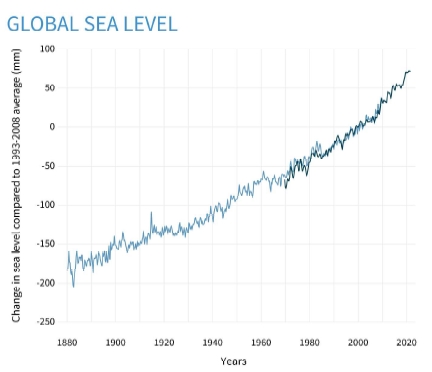 ผลกระทบที่เกิดจากการเปลี่ยนแปลงภูมิอากาศนี้ ส่งผลต่อการดำรงชีวิตของสิ่งมีชีวิตบนโลก รวมทั้งสิ่งแวดล้อม ระบบนิเวศ และอื่น ๆ หนึ่งในนั้นคือ การเพิ่มขึ้นของระดับน้ำทะเล จากข้อมูลพบว่า ระดับน้ำทะเลเฉลี่ยเพิ่มสูงขึ้นอย่างรวดเร็วนับจากปี ค.ศ. 1993 โดยเพิ่มจากเดิม 1.7 มิลลิเมตร/ปี เป็น 3.2 มิลลิเมตร/ปี และพบว่า จากปี ค.ศ. 1980 ระดับน้ำทะเลเพิ่มสูงขึ้นประมาณ 21 - 24 เซนติเมตร (ภาพ 3) นอกจากนี้ การเพิ่มขึ้นของอุณหภูมิผิวน้ำทะเลยังส่งผลกระทบต่อสิ่งมีชีวิตในทะเล เช่น การเกิดปะการังฟอกขาวซึ่งจะส่งผลกระทบต่อการดำรงชีวิตของสัตว์น้ำ ที่อาศัยปะการังเป็นแหล่งอาศัยของตัวอ่อนและเป็นแหล่งอาหาร