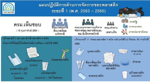 1. การลดและยกเลิกการใช้พลาสติก 4 ประเภท ได้แก่ ถุงพลาสติกหูหิ้วแบบบางที่มีความหนาน้อยกว่า 36 ไมครอน กล่องโฟมบรรจุอาหาร หลอดพลาสติก และแก้วพลาสติกแบบบางที่มีความหนาน้อยกว่า 100 ไมครอน