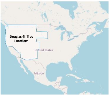 Douglas-fir (Pseudotsuga menziesii) เป็นต้นไม้ที่พบได้แถบ รัฐอริโซนา ทางเหนือของรัฐแคลิฟอร์เนีย รัฐโคโลราโด รัฐไอดาโฮ รัฐมอนทานา รัฐนิวแมกซิโก รัฐเนวาดา รัฐโอเรกอน รัฐเซาท์ดาโคตา รัฐยูทาห์ รัฐวอชิงตัน และรัฐไวโอมิง บริเวณที่พบ Douglas-fir ดังภาพ 3 โดย Douglas-fir เป็นต้นไม้ที่ใช้ในการจัดสวนและพบได้ในสวนสาธารณะ สวนรุกขชาติ สนามหญ้า และอื่นๆ ลักษณะของต้น เปลือก ใบ และผล แสดงในภาพ 4