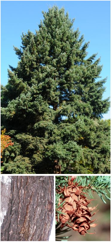 ภาพ 4 ต้น เปลือก ใบ และผล Douglas-fir Trees