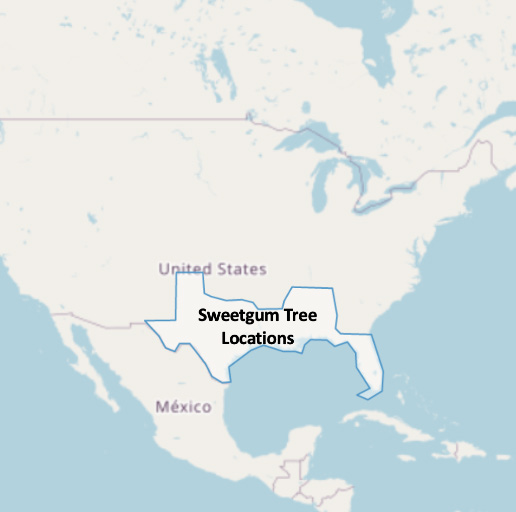 Sweetgum (Liquidambar styraciflua) เป็นต้นไม้ที่พบบริเวณอ่าวชายฝั่งของรัฐอลาบามา รัฐฟลอริดา รัฐหลุยเซียนา รัฐมิสซิสซิปปี และรัฐเท็กซัส บริเวณที่พบ Sweetgum ดังภาพ 7 โดย Sweetgum เป็นต้นไม้ที่ใช้ในการจัดสวน และพบได้ในสวนสาธารณะ สวนรุกขชาติ สนามหญ้า และอื่นๆ ลักษณะของต้น เปลือก ใบ และผล แสดงในภาพ 8