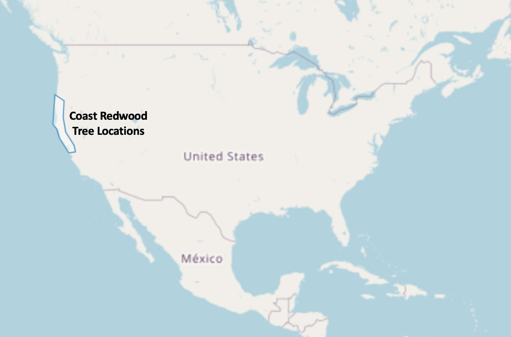 Coast Redwood เป็นต้นไม้ที่พบบริเวณทางใต้ของรัฐโอเรกอนไปจนถึงตอนกลางของรัฐแคลิฟอร์เนีย ระยะทางประมาณ 80 กิโลเมตรจากชายฝั่งแปซิฟิก บริเวณที่พบ Coast Redwood ดังภาพ 11 โดย Coast Redwood เป็นต้นไม้ที่ใช้ในการจัดสวน และพบได้ในสวนสาธารณะ สวนรุกขชาติ สนามหญ้า และอื่นๆ ลักษณะของต้น ลำต้น และผล แสดงในภาพ 12