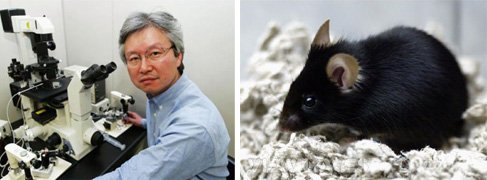 (ซ้าย) โทโมฮิโร โคโนะ และ (ขวา) คางูยะ หนูที่เกิดจากการตั้งครรภ์บริสุทธิ์