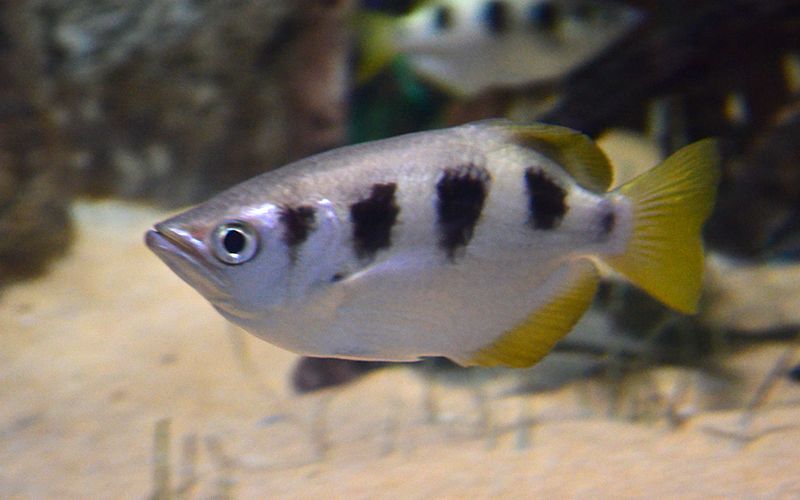 ปลาเสือพ่นน้ำ มีชื่อสามัญว่า : Common Archer Fish ชื่อวิทยาศาสตร์ : Toxotes chatareus เป็นปลาผิวน้ำขนาดเล็ก พบได้ทั้งในแหล่งน้ำจืดและน้ำกร่อย ลำตัวป้อมสั้นและแบนข้าง ความยาวลำตัวประมาณ 10-15 เซนติเมตร พื้นลำตัวสีเงินแซมเหลือง บริเวณท้องมีสีขาวเงิน มีแถบสีดำขนาดใหญ่พาดขวางลำตัว 5-6 แถบ ปากมีขนาดใหญ่และเฉียงขึ้นข้างบน ดวงตากลมโต และอยู่ค่อนไปทางสันหลังกลับกลอกไปมาได้ สีของครีบหลังและครีบก้นเป็นสีส้มอมเหลือง ขอบครีบเป็นสีดำ ครีบหลังส่วนหน้ามีก้านครีบแข็ง
