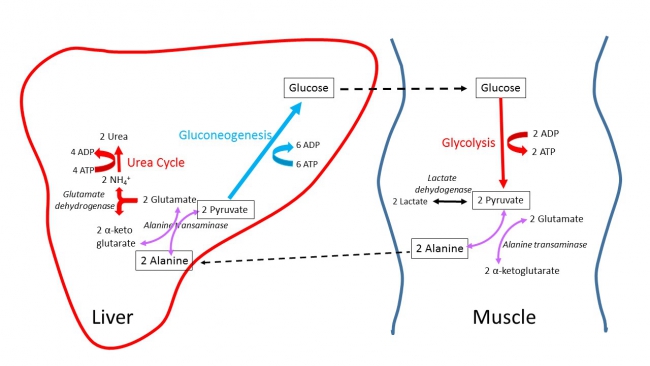 Glucose-Alanine Cycle เป็นวงจรของการสร้างกลูโคสจากการสลายโปรตีนเพื่อให้ได้พลังงาน โดยที่กล้ามเนื้อ กรดอะมิโนอะลานินจะถูกเปลี่ยนเป็นไพรูเวทด้วยปฏิกิริยา Transamination โดยมีเอ็นไซม์ ALT (Alanine transaminase) เป็นตัวเร่งปฏิกิริยา หลังจากนั้นไพรูเวทที่ได้จะถูกส่งเข้าสู่กระบวนการกลูโคนีโอจินิซิสที่เกิดขึ้นที่ตับ ได้เป็นน้ำตาลกลูโคสส่งออกจากตับไปให้กล้ามเนื้อเพื่อใช้เป็นพลังงาน และจากการสลายกรดอะมิโนนั้น ทำให้แอมโมเนีย (NH3) ที่ถูกปล่อยออกมาเข้าสู่วัฏจักรยูเรีย (urea cycle) เพื่อเปลี่ยนไปเป็นยูเรีย ก่อนจะถูกขับออกจากร่างกายในรูปของปัสสาวะ