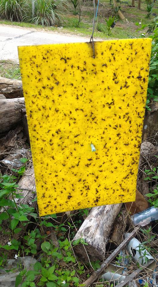 การใช้กับดักกาวเหนียวในแปลงผัก กรณีที่มีศัตรูพืชระบาด ควรติดตั้งกับดักให้สูงประมาณ 30 เซนติเมตร หรือสูงกว่ายอดต้นผักเมื่อเจริญเติบโตเต็มที่แล้ว โดยใช้กับดักประมาณ 60-80 กับดัก/พื้นที่ 1 ไร่ ส่วนในฤดูที่มีการระบาดของศัตรูพืชน้อยอาจใช้เพียง 15 – 20 กับดัก/ไร่