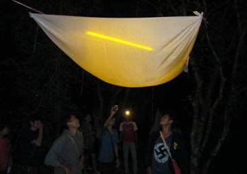 ส่วนประกอบ หลอดไฟ ที่ใช้บ่อยคือ หลอดนีออนสีม่วง ที่เรียก แบล็คไลท์ ขนาด 20 หรือ 40 วัตต์ ที่ใช้ในการล่อแมลงโดยทั่วไปหรือ หลอดที่เรียกว่า mercury vapour lamp ขนาด 125 วัตต์ (ภาพที่ 2) ซึ่งเป็นหลอดที่ผลิตลำแสงที่มีช่วงคลื่นสั้น คือ อัลตาไวโอเล็ต ที่แมลง โดยเฉพาะผีเสื้อกลางคืนสามารถรับได้อย่างดี ฉากผ้าสีขาว ซึ่งมีขนาด 1.5x1.2 ม หรือ 1.5x1.5 ม เป็นต้น