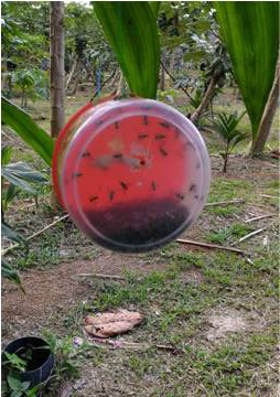 3. ในกรณีที่ใช้เหยื่อซึ่งเป็นพวกโปรตีน เช่น เนื้อ หรือปลาหมึก ที่มีกลิ่น โดยใช้ลวดแขวนเหยื่อให้อยู่ตรงกลางของก้นถ้วย เมื่อแมลงได้กลิ่นจะเดินมาหา และตกลงในถ้วยที่มีสารละลายอยู่ ใช้เวลา 1-5 วัน ถ้าเป็นกับดักด้วงมูลสัตว์ จะใช้กับดักที่ดัดแปลงมาจากขวดพลาสติกขนาด 980 มิลลิลิตร ตัดเอาส่วนคอขวดออก ใช้เป็นกรวยวางปิดปากขวด ขุดหลุมสำหรับวางกับดักลึกประมาณ 15 เซนติเมตร วางกับดักให้ปากขวดเสมอพื้นดิน ใส่เหยื่อมูลสุกรสดปริมาณ 70 กรัม โดยที่ในขวดไม่ต้องเติมน้ำยารักษาสภาพ ทิ้งไว้ 1-5 วัน เช่นกัน