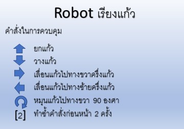 ที่นำเสนอในเว็บไซต์ของคุณครูณัฐพล บัวอุไร โดยกิจกรรมโรบอทเรียงแก้ว เป็นกิจกรรม ที่ทำให้ผู้เรียนได้กระบวนการคิด การแก้ปัญหาอย่างเป็นขั้นตอนในรูปแบบของคอมพิวเตอร์ ที่เรียกว่าแนวคิดเชิงคำนวณเป็นกิจกรรมที่นักเรียนทำได้ในทุก ๆ ระดับ โดยครูสามารถปรับเปลี่ยนการจัดวางแก้วให้มีความยากง่ายต่างกันออกไปในแต่ละระดับ