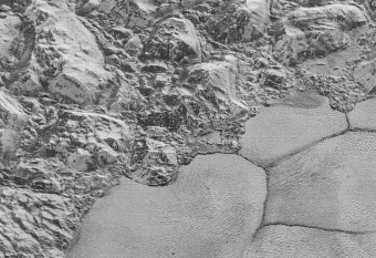 รูปที่ 2 ภาพจากยานอวกาศนิวใฮไรซอนส์แสดงพื้นผิวดาวพลูใดที่มีสภาพเป็นน้ำแข็ง