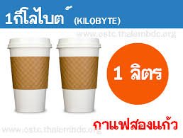 1 กิโลไบต์ (Kilobyte) ก็จะเทียบได้กับปริมาณน้ำ 1 ลิตร หรือ ปริมาตรการตวงขนาด 2 แก้วกาแฟ ขนาด 16 oz