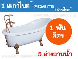 ใหญ่ขึ้นมาอีก 1 เมกาไบต์ (Megabyte) ก็จะเทียบได้กับปริมาณน้ำ 1 พันลิตร หรือ เท่ากับปริมาณน้ำในอ่างอาบน้ำ 5 อ่าง