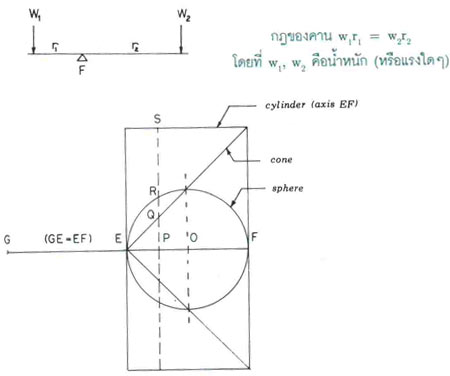 หลักการของคานที่นำมาประยุกต์ใช้กับเรขาคณิต ระบบ PS ตั้งฉากกับ GF ที่จุดใดของ P จะตัดกับ รูปทรงกลม รูปทรงกรวย และ รูปทรงกระบอกโดยมีรัศมี PR,PQ และ PS ตามลำดับ อาร์คีมีดีสพิสูจน์ให้เห็นว่าวงกลมสองวงแรก (ซึ่งน้ำหนักของทั้งสองวงกลมได้สัดส่วนกับพื้นที่ของทั้งสองวงกลม) ที่วางอยู่บนคาน GEF ที่จุดหมุน E จะได้สมดุลกันกับวงกลมที่สามที่จุด P จากสิ่งนี้เขาจึงสามารถหาปริมาตรของส่วนของทรงกม หรือกระทั่งปริมาตรของทรงกลมทั้ง (4¶r3/3)