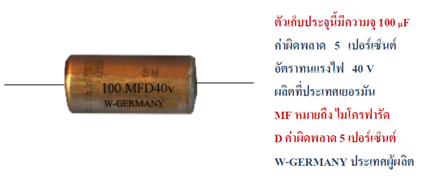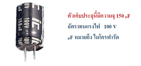 ค่าความจุจะพิมพ์ติดไว้บริเวณตัวเก็บประจุ ตัวอย่างเช่น 100