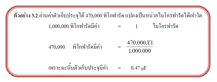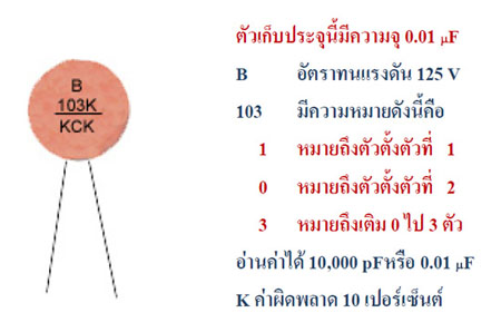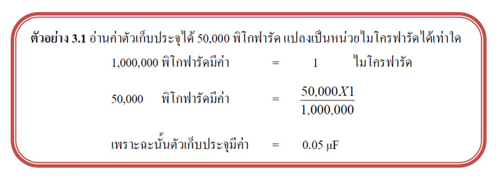 จากในรูปที่ 3.7 เขียนตัวเลข 103 บนตัวเก็บประจุจะอ่านค่าได้ 10 และเติม 0