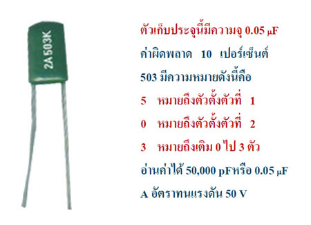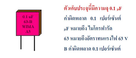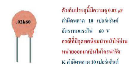 ซึ่งมักแสดงค่าที่ตัวเก็บประจุ เช่น 5 พิโกฟารัด (PF) 10 ไมโครฟารัด (uF)