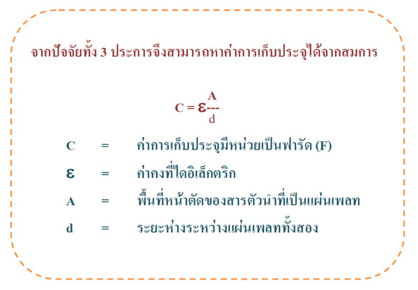 ค่าความจุของตัวเก็บประจุจะมีค่ามากหรือน้อยขึ้นอยู่กับตัวแปร 3 ประการคือ