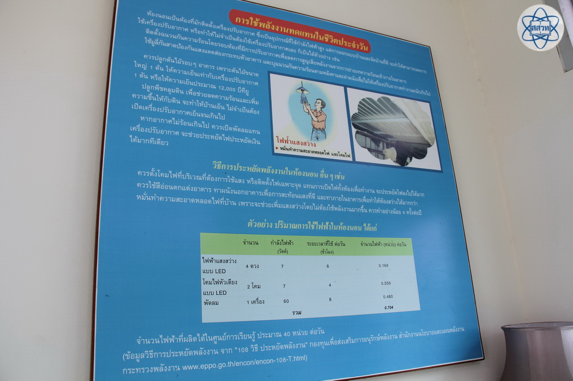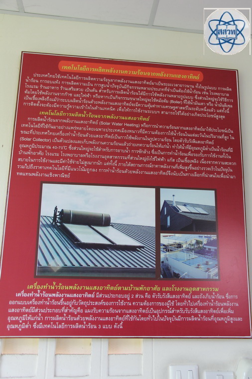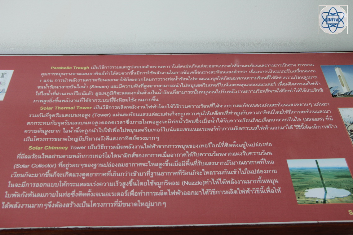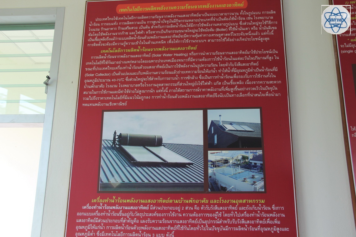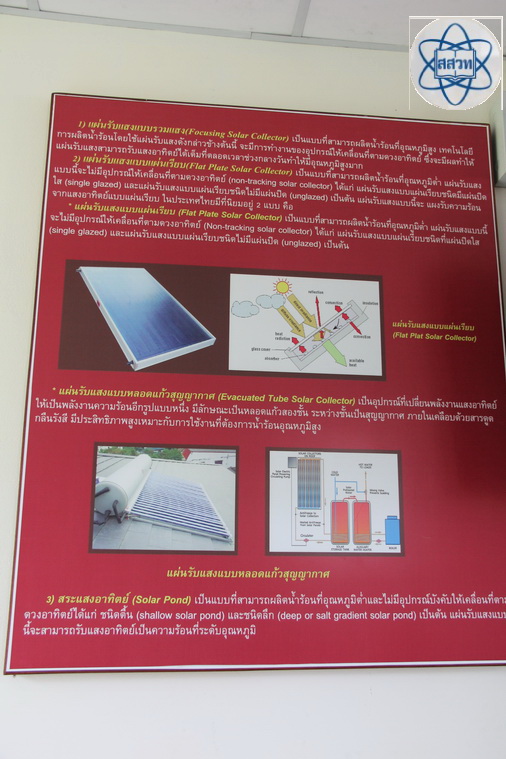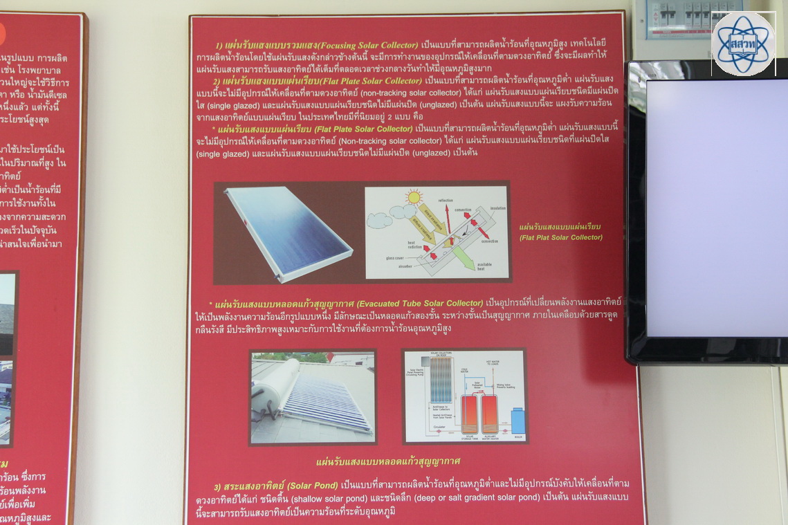 อาคารนี้จัดแสดงการใช้พลังงานแสงอาทิตย์ในการผลิตความร้อน และการผลิตไฟฟ้า โดยการผลิตไฟฟ้าจากแสงอาทิตย์ ได้แบ่งออกเป็น 2 ลักษณะ คือ การผลิตไฟฟ้าด้วยระบบรวมแสงอาทิตย์ เพื่อต้มน้ำป้อนให้กังหันไอน้ำขับเครื่องกำเนิดไฟฟ้า และการผลิตไฟฟ้าด้วยเซลล์แสงอาทิตย์ (Solar Cell) โดยการเปลี่ยนพลังงานแสงเป็นพลังงานไฟฟ้าโดยตรง มีการจัดแสดงเซลล์แสงอาทิตย์ชนิดต่าง ๆ รวมถึงจัดแสดงอุปกรณ์ผลิตน้ำร้อนโดยใช้พลังงานแสงอาทิตย์ และภายนอกอาคารยังมีการติดตั้งแผงเซลล์แสงอาทิตย์ เพื่อใช้ผลิตพลังงานไฟฟ้าใช้ภายในศูนย์การเรียนรู้