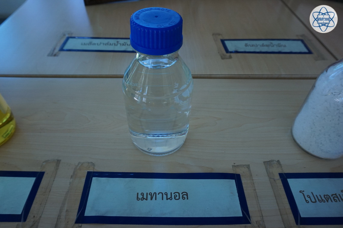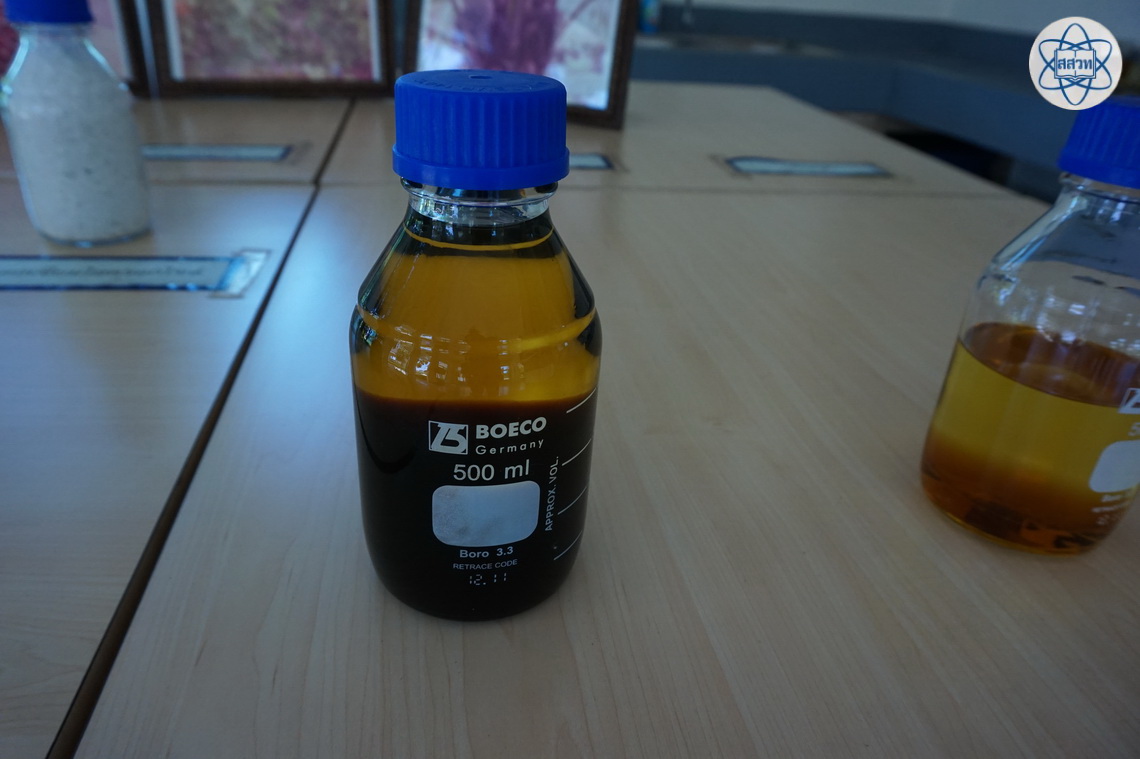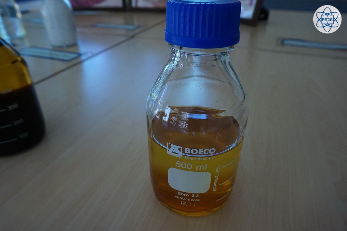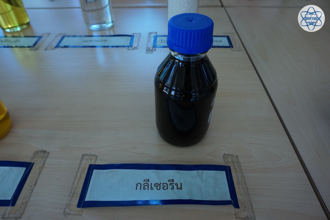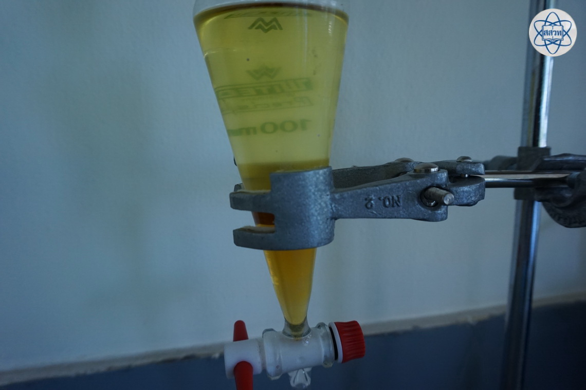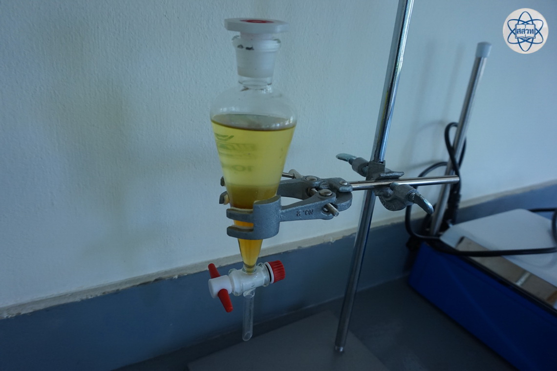4) ทิ้งไว้ประมาณ 1 คืน เพื่อให้กลีเซอรีนแยกออกจากน้ำมันไบโอดีเซล โดยไบโอดีเซลจะอยู่ด้านบน และกลีเซอรีนจะตกตะกอนอยู่ด้านล่าง หลังจากนั้นทำการแยกเอากลี เซอรีนออก