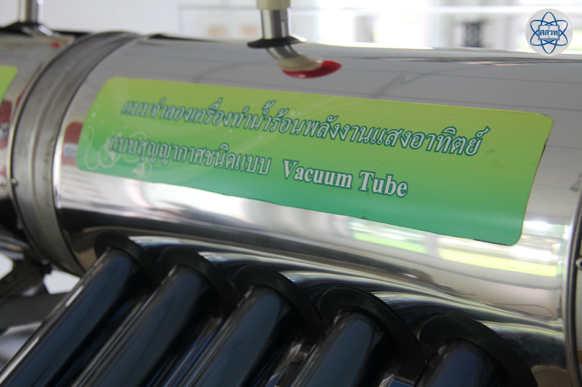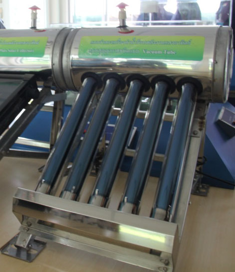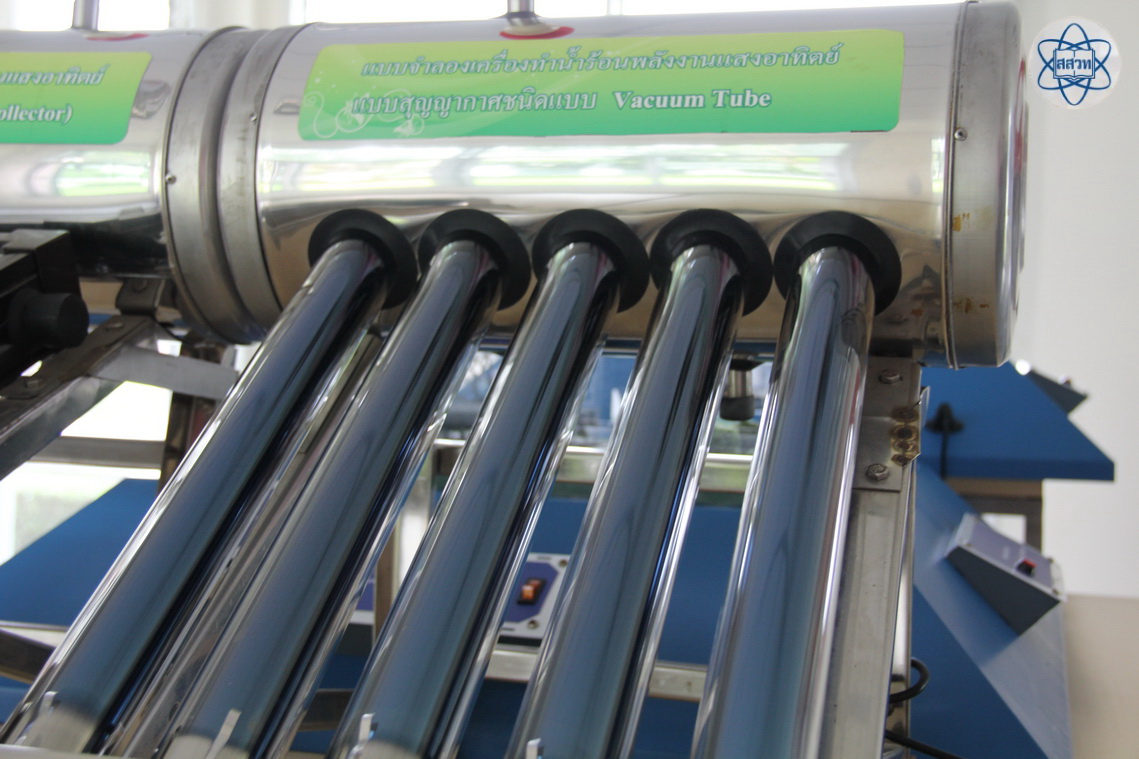 ตัวเก็บรังสีชนิดหลอดแก้วสุญญากาศ มีลักษณะเป็นหลอดแก้ว 2 ชั้น เพื่อลดการสูญเสียความร้อน ภายในประกอบด้วยแผ่นดูดรังสีที่เชื่อมต่อกับทองแดงเป็นสุญญากาศหรือมีความดันต่ำใช้บรรจุของเหลว ปลายท่อทองแดงทำหน้าที่เป็นตัวแลกเปลี่ยนความร้อน (Heat Exchanger or Heat Condenser) เชื่อมต่อกับท่อส่งน้ำ ซึ่งตัวเก็บรังสีชนิดหลอดแก้วสุญญากาศมีหลักการทำงาน คือ พลังงานแสงอาทิตย์เมื่อตกกระทบกับหลอดแก้วสุญญากาศ แผ่นดูดรังสีที่อยู่ภายในจะรับพลังงานแสงอาทิตย์และถ่ายเทความร้อนให้กับท่อทองแดงกลายเป็นไอร้อนระเหยไปสู่ตัวแลกเปลี่ยนความร้อนที่เชื่อมกับท่อส่งน้ำ ตัวแลกเปลี่ยนความร้อนจะมีอุณหภูมิสูงขึ้น เมื่อมีน้ำไหลผ่านจะเกิดการถ่ายเทความร้อน ทำให้ไอร้อนที่ตัวแลกเปลี่ยนความร้อนมีอุณหภูมิลดลงแล้วควบแน่นตกลงสู่ด้านล่างของท่อทองแดงเป็นวงจร ตัวอย่างการนำตัวเก็บรังสีชนิดแผ่นเรียบที่นำไปใช้งาน เช่น เครื่องทำร้อนพลังงานแสงอาทิตย์แบบหลอดแก้วสุญญากาศ เป็นต้น