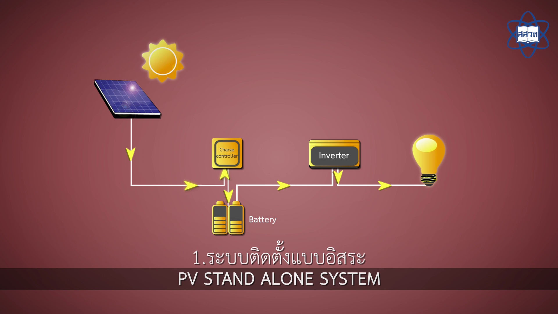 1) การใช้งานแบบไม่เชื่อมต่อระบบจำหน่ายไฟฟ้า มีวัตถุประสงค์เพื่อใช้งานเฉพาะครัวเรือนหรือในพื้นที่ห่างไกลจากระบบสายส่งไฟฟ้า ซึ่งระบบผลิตไฟฟ้าประกอบด้วย แผงเซลล์แสงอาทิตย์ แบตเตอรี่ อุปกรณ์ควบคุมการประจุแบตเตอรี่ และอินเวอร์เตอร์