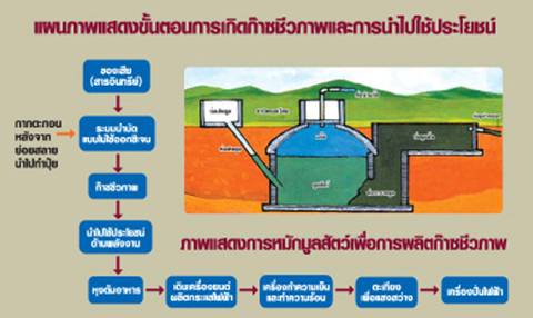 2.1 กระบวนการย่อยสลายในที่ที่ไม่มีอากาศ โดยผลิตภัณฑ์ที่ได้เป็นก๊าซผสมระหว่างมีเทน และคาร์บอนไดออกไซด์ และอาจมีก๊าซอื่นปนอยู่บ้าง เช่น ไฮโดรเจนซัลไฟด์ ไฮโดรจน และไนโตรเจน ซึ่งถูกนำไปใช้เป็นเชื่อเพลิงในการหุงต้มและให้แสงสว่าง เป็นเชื้อเพลิงแทนน้ำมันเตา ในการผลิตไอน้ำในหม้อไอน้ำ หรือใช้ในการผลิตไฟฟ้า