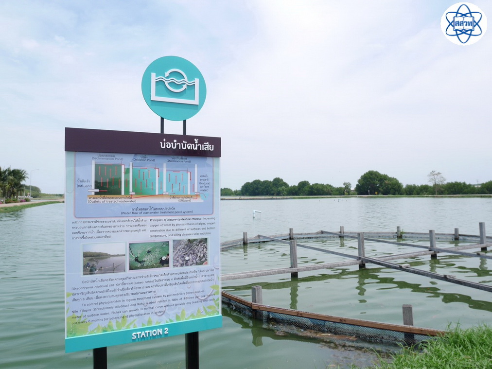 ระบบบ่อบำบัดน้ำเสีย เป็นระบบที่ใช้การกักพักน้ำเสียเอาไว้ในบ่อบำบัดเป็นระยะเวลาที่เหมาะสมกับปริมาณความสกปรกของน้ำ ระบบบ่อบำบัดใช้การเติมออกซิเจนด้วยกระบวนการสังเคราะห์แสงของแพลงก์ตอนและสาหร่ายเพื่อให้จุลินทรีย์หายใจและย่อยสลายสารอินทรีย์ (Organic matter) ในน้ำเสีย สามารถลดความสกปรกในรูปของค่า BOD ได้ถึงร้อยละ 85-90 ระบบบ่อบำบัดน้ำเสียของโครงการฯ มีทั้งหมด 5 บ่อ แบ่งเป็น 3 ประเภท ประกอบด้วย บ่อตกตะกอน จำนวน 1 บ่อ บ่อผึ่ง จำนวน 3 บ่อ และบ่อปรับสภาพ จำนวน 1 บ่อ โดยการออกแบบบ่อบำบัดให้มีความลาดชัน 1:1000 ต่อต้นแบบอนุกรม แต่ละบ่อใช้ระยะเวลากักพักน้ำเสียโดยประมาณ 7 วัน เพื่อช่วยในการฆ่าเชื้อโรค และให้น้ำเสียเติมเต็มทุกวัน น้ำเสียของแต่ละบ่อจะไหลล้นจากด้านบนและไหลเข้าสู่ด้านล่างของบ่อถัดไป