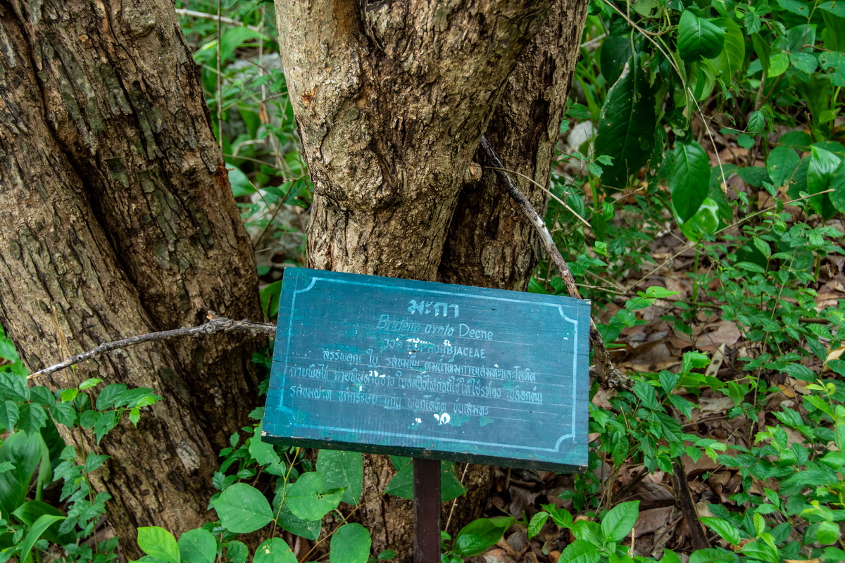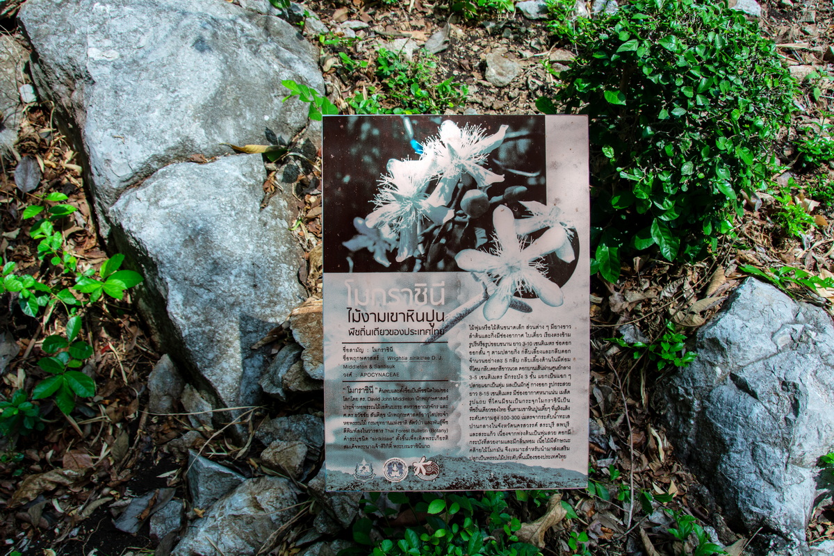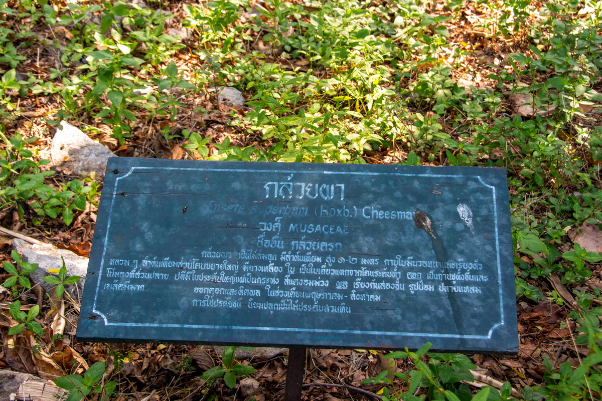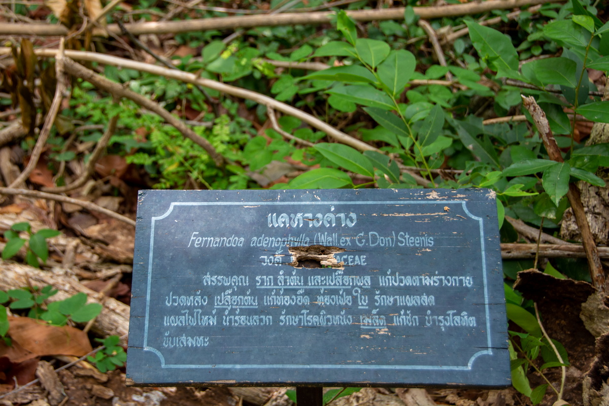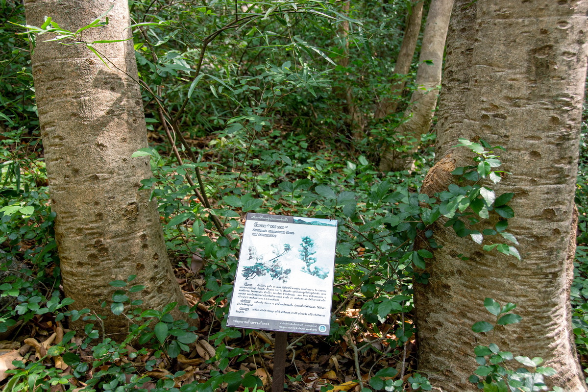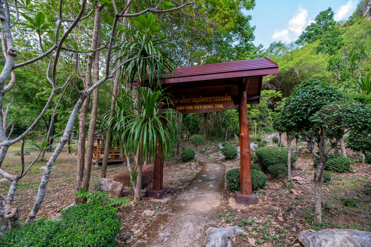 บัวสันโดษ หรือ ชื่อเรียกอื่นๆ แผ่นดินเย็น ว่านพระฉิม ชื่อทางวิทยาศาสตร์ Nervilia aragoana Gaud. จัดอยู่ในวงศ์ : ORCHIDACEAE เป็นไม้ล้มลุกลงหัวขนาดเล็ก ลำต้นงอกออกจากหัว ซึ่งเป็นสมุนไพรบำรุงกำลัง แก้โรคหัวใจ แก้จุกเสียดแน่นและแก้พิษไข้ ลักษณะพิเศษคือ จะออกส่วนของดอกก่อน เมื่อดอกโรยจะเป็นใบ ดังนั้นคนส่วนใหญ่จึงจะคุ้นกับบัวสันโดษที่เป็นใบแล้ว นอกจากนี้ยังมีพันธุ์ไม้และพืชสมุนไพรอีกมากมายหลายอย่าง เช่น กะเบาลิง สมพง ปออีเก้ง มะหาด มะไฟป่า สาบเสือ กระท่อมเขียว จันทน์ผา สลัดใด มะกา ซึ่งล้วนแต่เป็นพืชที่มีคุณสมบัติเป็นยาได้ จึงทำให้ที่นี่เป็นแหล่งเรียนรู้เกี่ยวกับพืชสมุนไพรอีกด้วย