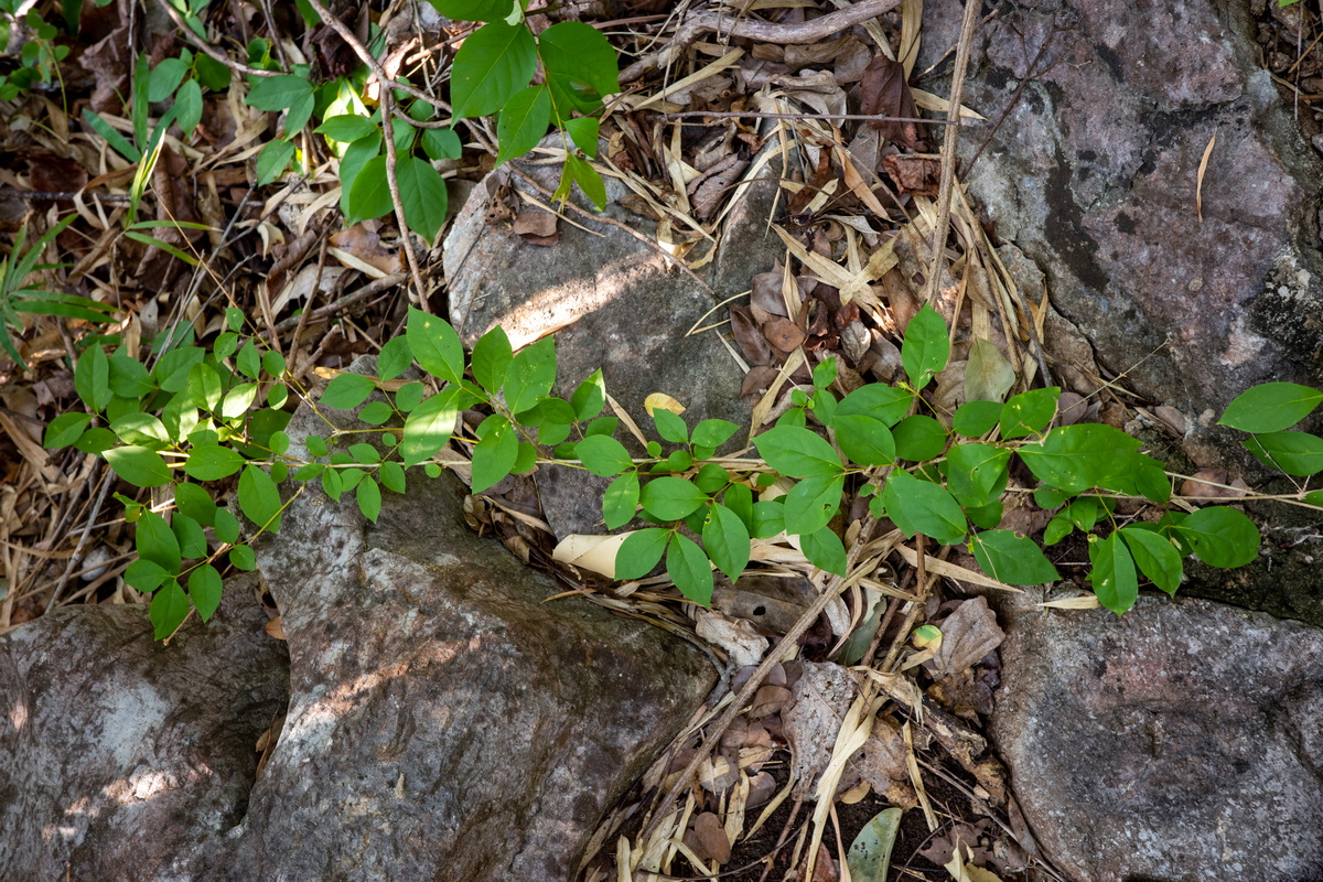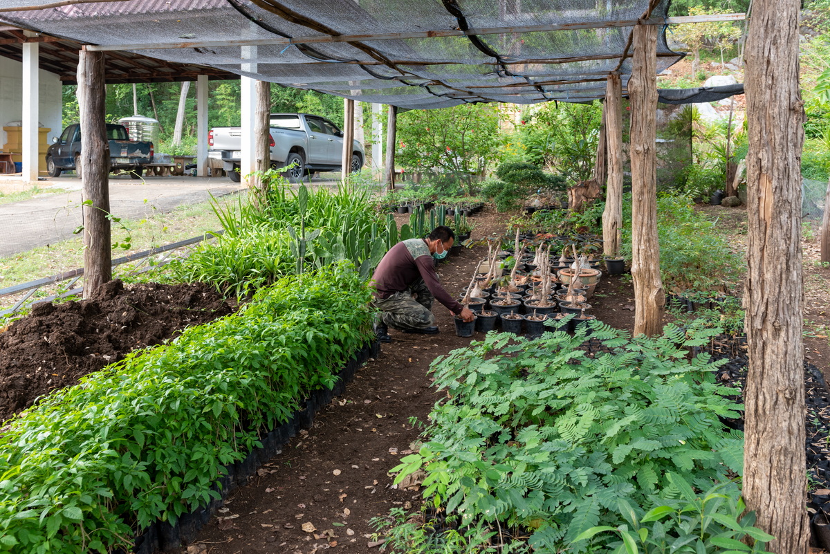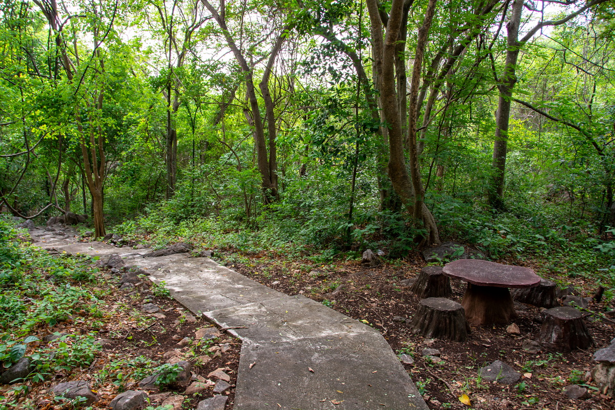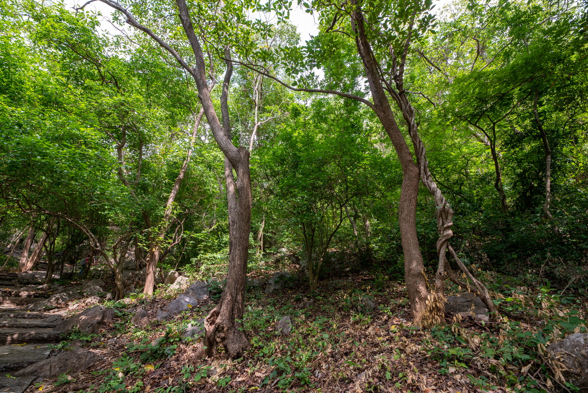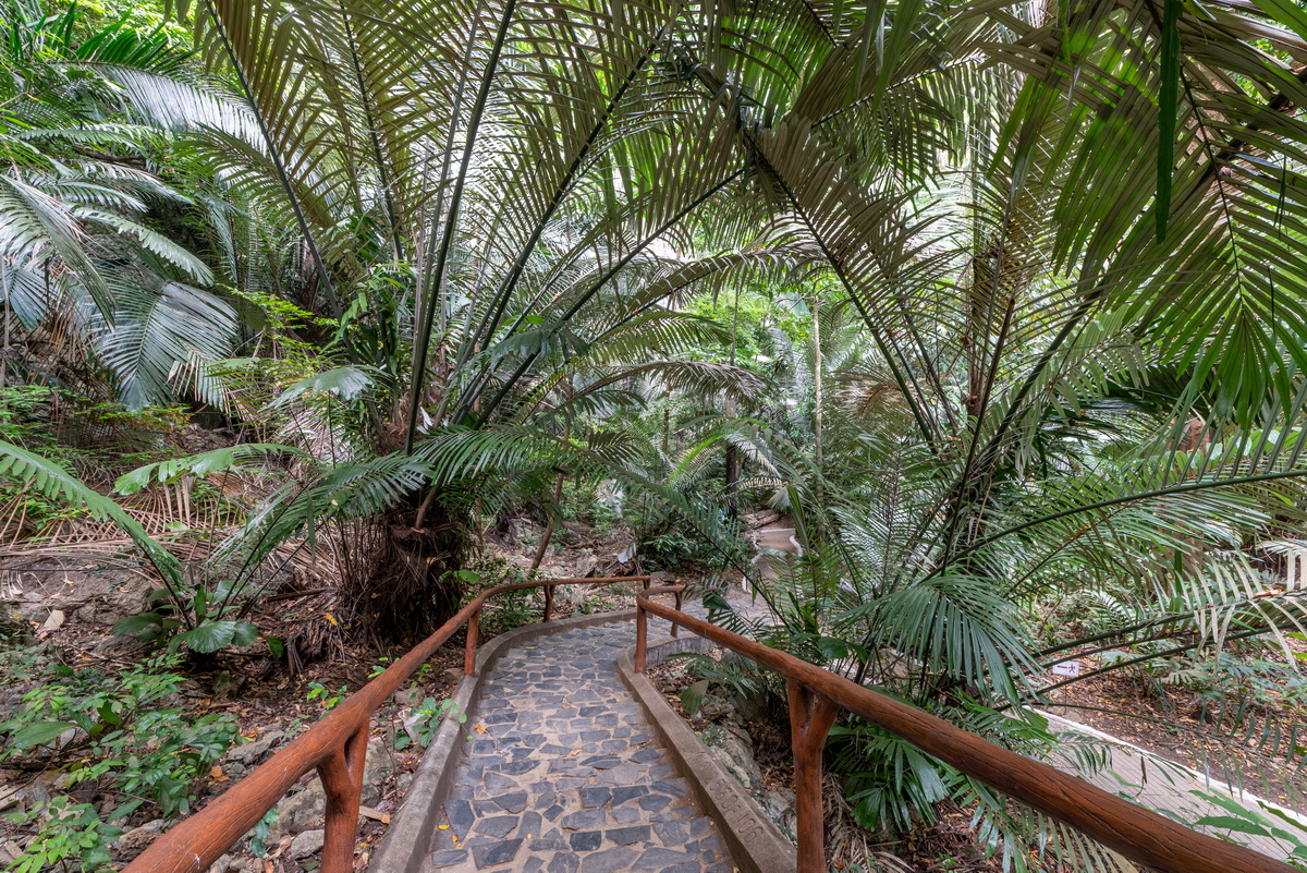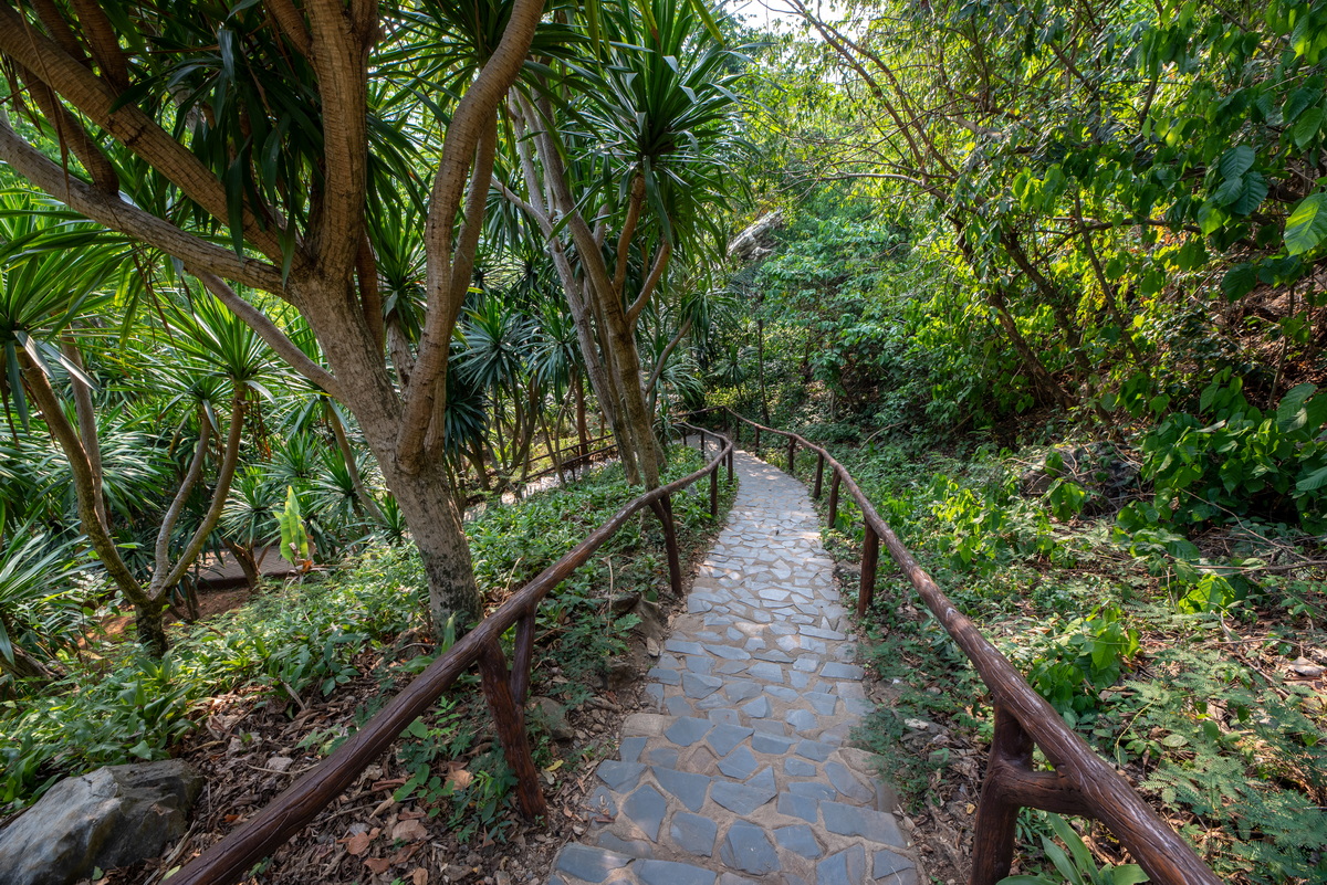 บัวสันโดษ หรือ ชื่อเรียกอื่นๆ แผ่นดินเย็น ว่านพระฉิม ชื่อทางวิทยาศาสตร์ Nervilia aragoana Gaud. จัดอยู่ในวงศ์ : ORCHIDACEAE เป็นไม้ล้มลุกลงหัวขนาดเล็ก ลำต้นงอกออกจากหัว ซึ่งเป็นสมุนไพรบำรุงกำลัง แก้โรคหัวใจ แก้จุกเสียดแน่นและแก้พิษไข้ ลักษณะพิเศษคือ จะออกส่วนของดอกก่อน เมื่อดอกโรยจะเป็นใบ ดังนั้นคนส่วนใหญ่จึงจะคุ้นกับบัวสันโดษที่เป็นใบแล้ว นอกจากนี้ยังมีพันธุ์ไม้และพืชสมุนไพรอีกมากมายหลายอย่าง เช่น กะเบาลิง สมพง ปออีเก้ง มะหาด มะไฟป่า สาบเสือ กระท่อมเขียว จันทน์ผา สลัดใด มะกา ซึ่งล้วนแต่เป็นพืชที่มีคุณสมบัติเป็นยาได้ จึงทำให้ที่นี่เป็นแหล่งเรียนรู้เกี่ยวกับพืชสมุนไพรอีกด้วย