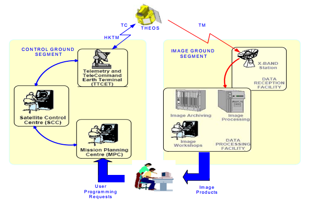 จากที่กล่าวมาข้างต้นจะกล่าวถึงระบบควบคุมดาวเทียม แต่ถ้าหากกล่าวถึงการทำงานของระบบดาวเทียม THEOSระบบดาวเทียมธีออส ประกอบไปด้วย 2 ส่วนหลัก ๆ ได้แก่ ส่วนอวกาศ (Space Segment)และส่วนภาคพื้นดิน (Ground Segment) ซึ่งในส่วนของการทำงานของภาคพื้นดิน จะประกอบไปด้วยการทำงานหลักๆ ดังนี้