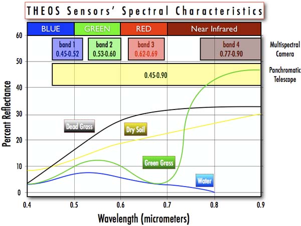- คุณสมบัติทางด้านสเปกตรัม (Spectral Performance) ที่จะได้จากข้อมูลภาพถ่ายดาวเทียมTHEOS ทั้งจากกล้องภาพถ่ายขาวดำ และกล้องภาพถ่ายสีนั้น ช่วงคลื่นสีที่ได้จากกล้องถ่ายภาพสีจะสามารถรองรับและเพียงพอต่อการแยกแยะรายละเอียดของสิ่งที่ต้องการวิเคราะห์บนผิวโลกได้อย่างดี ในขณะเดียวกันข้อมูลที่ได้จากกล้องขาวดำซึ่งเป็นข้อมูลที่ให้ความละเอียดของจุดภาพสูงอยู่แล้ว ประกอบทั้งมีช่วงสเปกตรัมที่กว้างครอบคุลมช่วงสเปกตรัมทั้งหมดของกล้องถ่ายภาพสี จึงทำให้ได้ข้อมูลจากสิ่งที่ต้องการวิเคราะห์ทั้งหมด