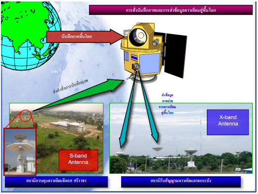 2.1 สถานีรับภาพ ( Image Receiving Station) ทำหน้าที่รับสัญญาณข้อมูลภาพโดยสถานีรับสัญญาณ ( X-band Station) ซึ่งมีการควบคุมทิศทางของจานรับสัญญาณดาวเทียม (Antenna ) ให้เคลื่อนที่หันตามดาวเทียม ในระหว่างที่รับสัญญาณข้อมูลและสัญญาณดังกล่าวจะถูกขยายให้มีกำลังแรงขึ้นโดยอุปกรณ์ขยายสัญญาณที่เรียกว่า Low Noise Amplifier แล้วลดความถี่ของสัญญาณข้อมูล และทำการแปลงสัญญาณที่อยู่ในรูปของคลื่นวิทยุให้เป็นสัญญาณข้อมูลแบบดิจิตอล ( ECL Bit Stream ) เพื่อส่งให้กับหน่วยประมวลผลข้อมูลต่อไป