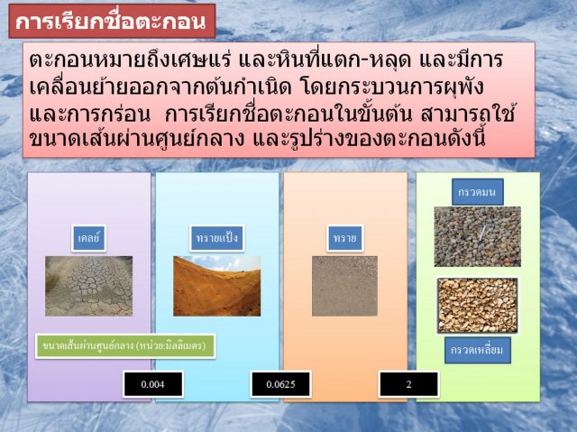 | ระหว่าง 0.0625 – 2 มิลลิเมตร | กรวดเหลี่ยม | ![]() |