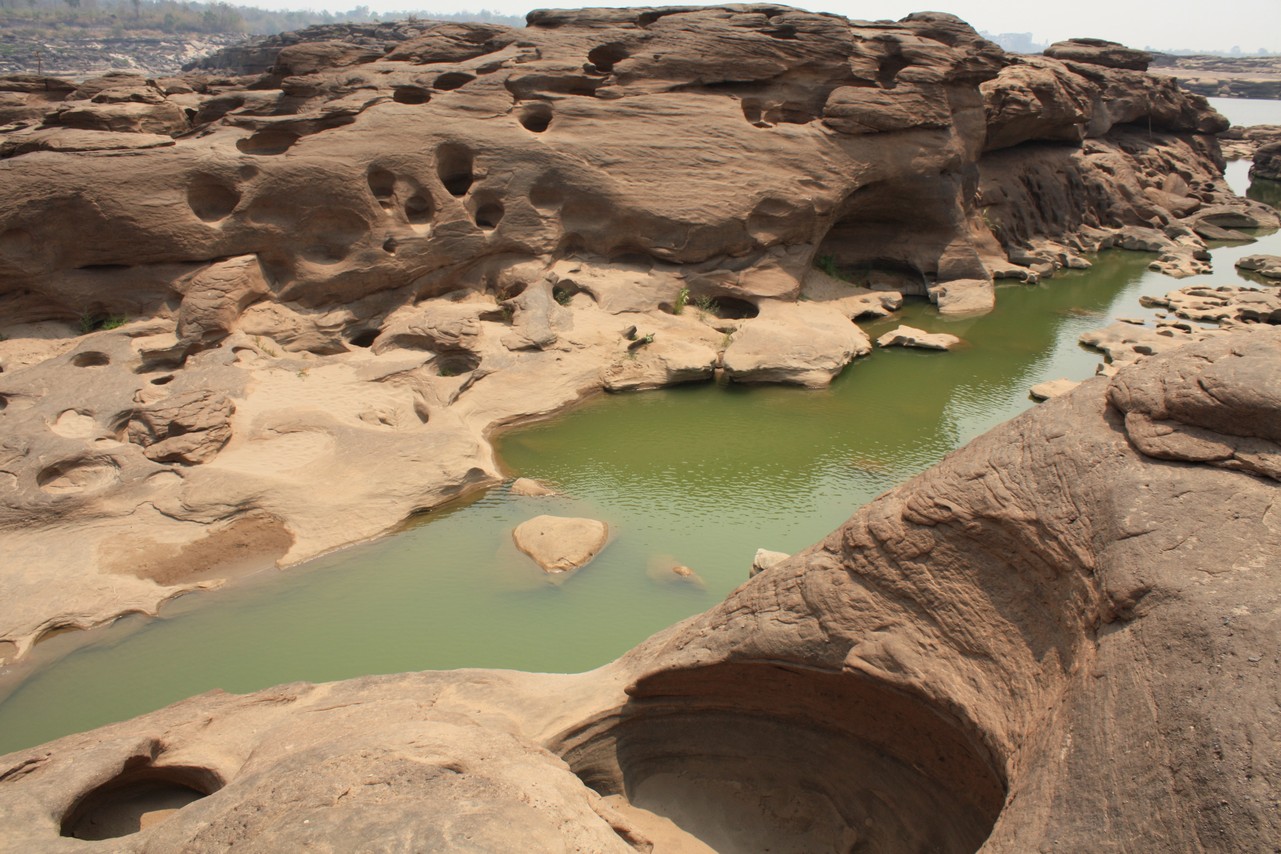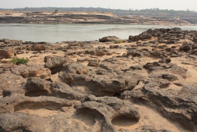 ตัวกลางในการกร่อน : แม่น้ำโขง โดยอาศัย แรงโน้มถ่วง กระแสน้ำ ที่ทำให้เกิดการกัดเซาะ และตะกอนขนาดกรวดและทราย ที่ทำให้เกิดการขัดสี