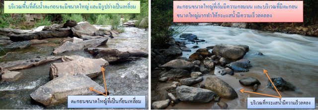 ก้อนหินมนใหญ่ บริเวณน้ำแม่แจ่ม การมนของหินเป็นผลจากการขัดสี และการชนของตะกอนขนาดเล็กกว่า และจากกระแสน้ำ ในภาพยังแสดงการสะสมตัวของตะกอนทรายเกิดขึ้นในบริเวณที่กระแสน้ำมีความเร็วลดลง