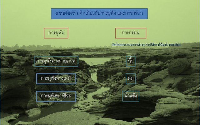 แม้ว่าเนื้อหาหลักที่เกี่ยวข้องกับทัศนศึกษาแหล่งเรียนรู้ออนไลน์ “แก่งหินงามสามพันโบก” จะเป็นเรื่อง กระบวนการกร่อน แต่ การศึกษาการกร่อน โดยไม่ศึกษาเรื่องการผุพัง จะเป็นการศึกษาโดยไม่ครบเนื้อหา และขาดความต่อเนื่อง