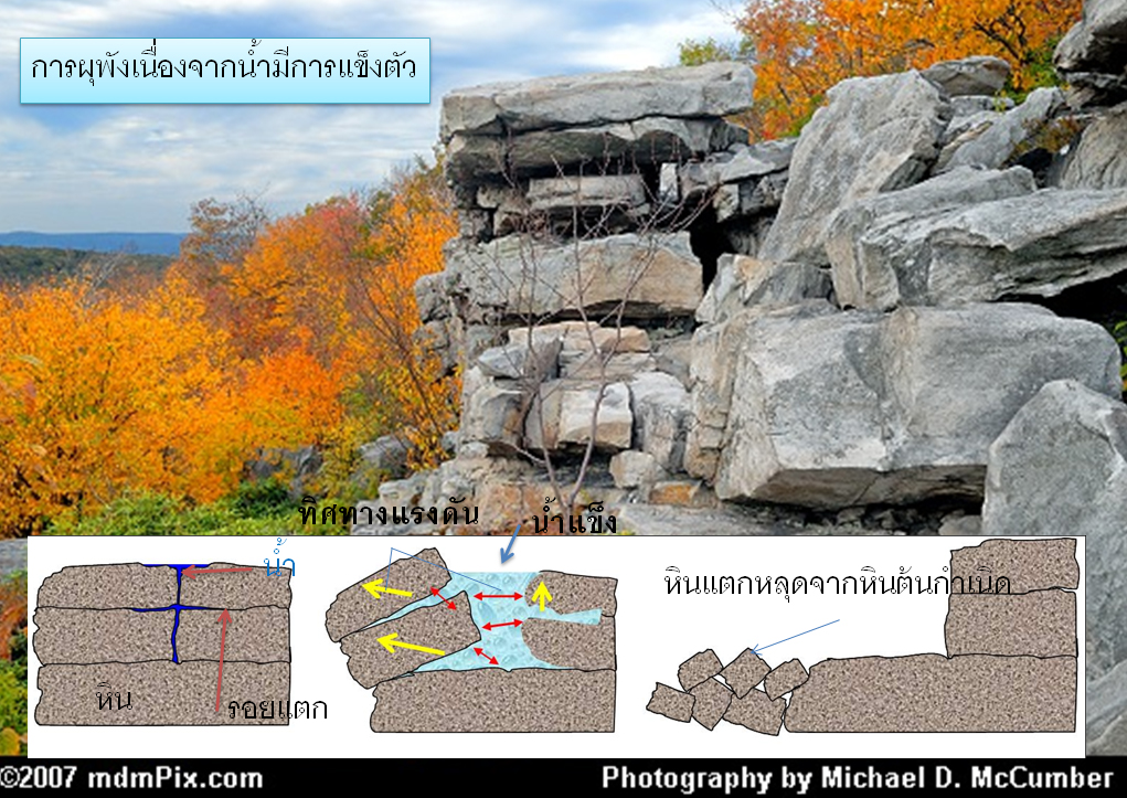 การผุพังเนื่องมาจากการหายไปของความดันที่เคยกดทับ ทำให้หินแตกเป็นกาบมน (พบมากกับหินแกรนิต) - การผุพังเนื่องจากน้ำมีการแข็งตัว เกิดในสภาพภูมิอากาศหนาว น้ำเมื่อเปลี่ยนสถานะเป็นของแข็ง ปริมาตรจะขยายตัว 9%