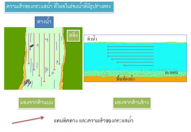ความเร็วของทางน้ำในกรณีที่ทางน้ำมีรูปร่างตรง ความเร็วจะมากบริเวณส่วนกลางของลำน้ำ เนื่องจากผลจากแรงเสียดทานที่เกิดขึ้นระหว่างน้ำ กับร่องน้ำบริเวณดังกล่าวมีค่าน้อย