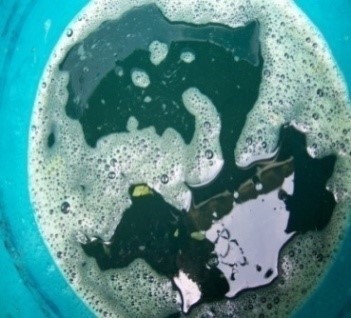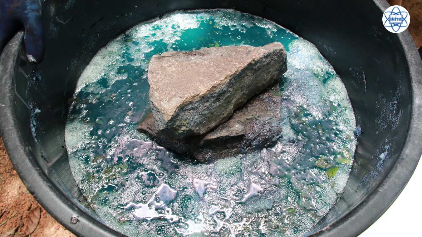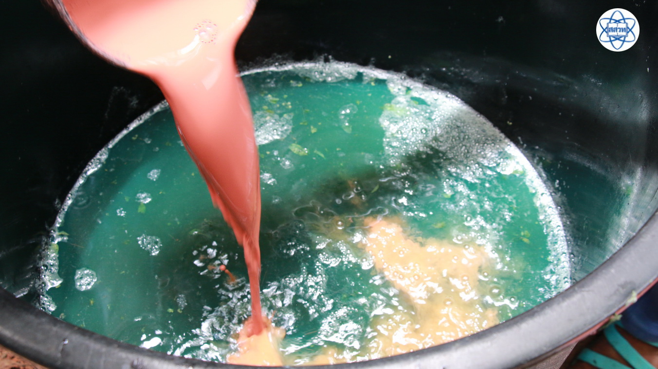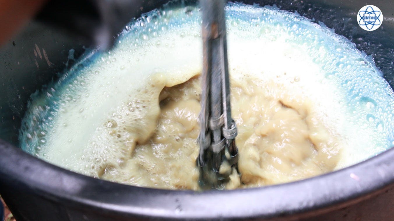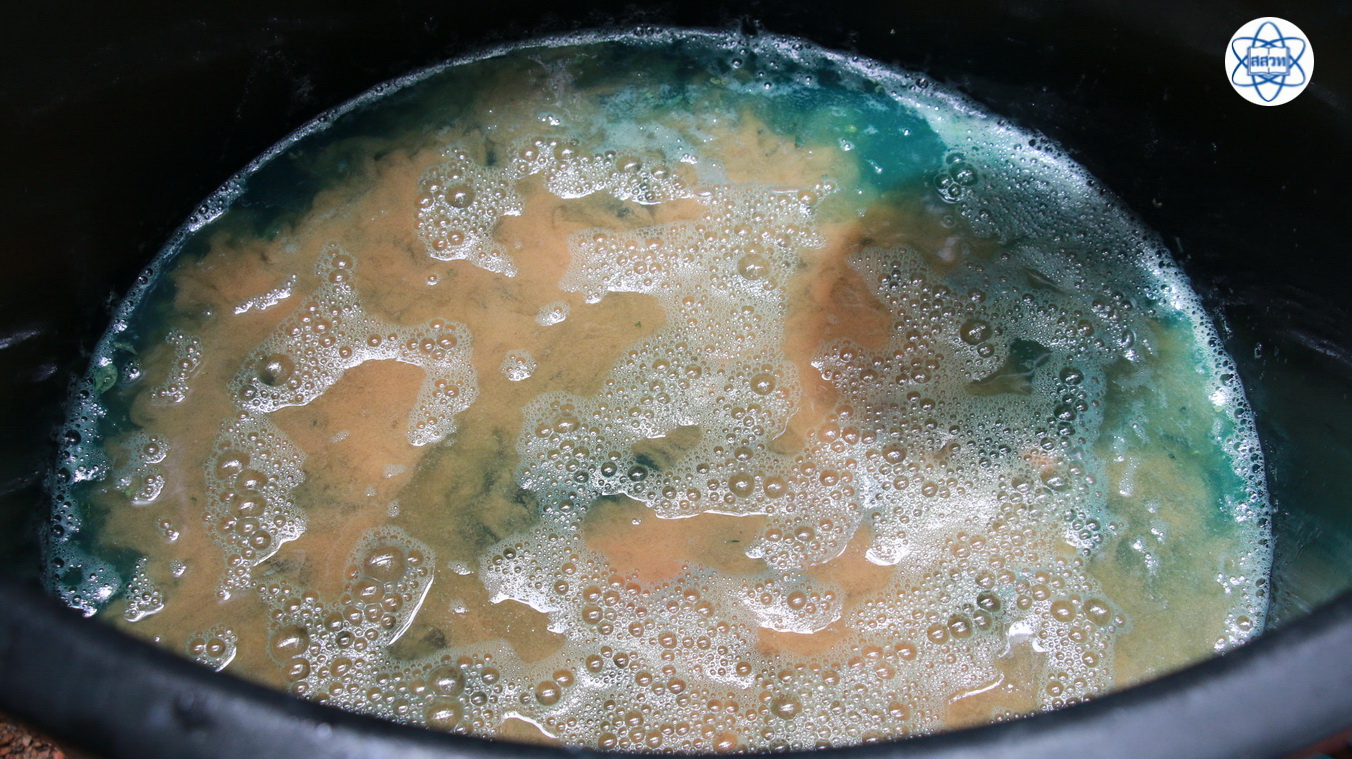 เติมปูนให้พอดี น้ำครามเปลี่ยนเป็นสีเหลือง ฟองสีน้ำเงิน
