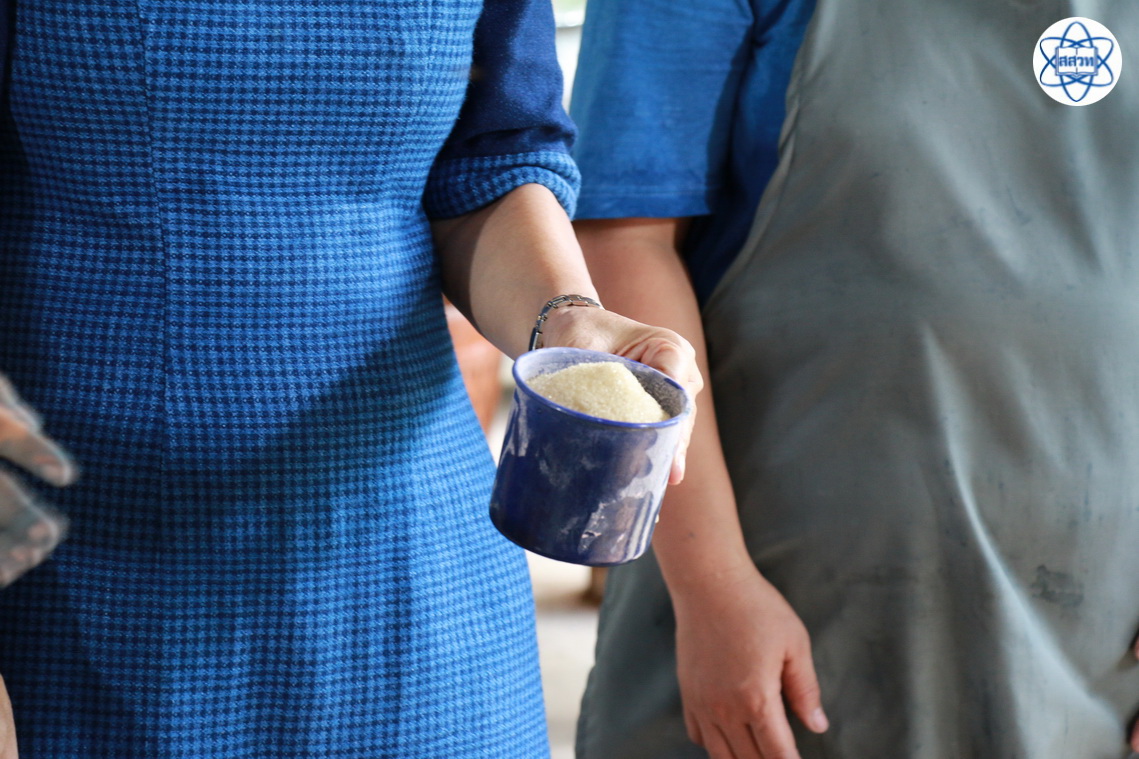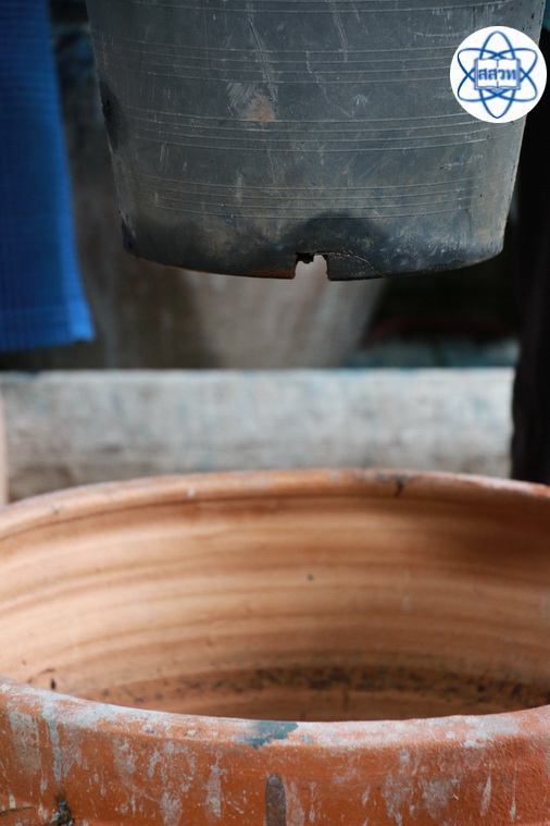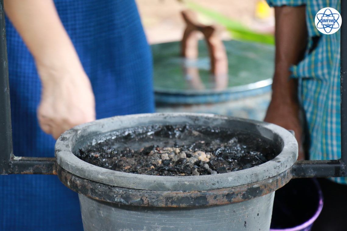 ซ้าย : ขี้เถ้าชื้น กลาง : กดอัดขี้เถ้าในถังกรอง ขวา : เทน้ำใส่ถังกรองและกรองน้ำขี้เถ้า