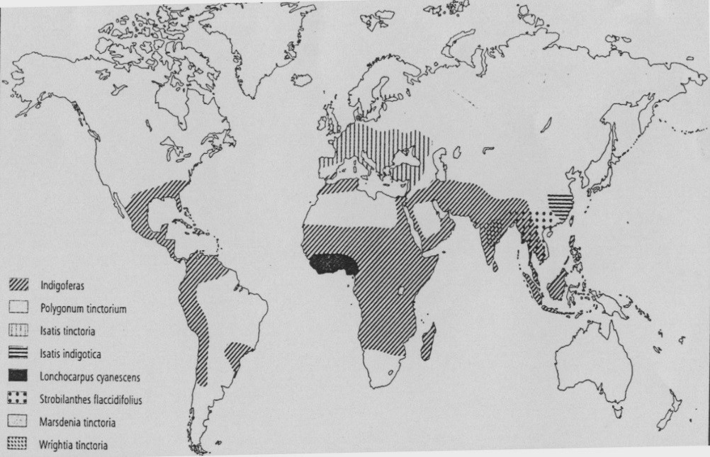 ดังกล่าวแล้วว่าพืชให้สีครามมีหลายวงศ์ กระจายอยู่แถบเขตศูนย์สูตรและเขตอบอุ่น ดังแผนที่รูปที่ 4