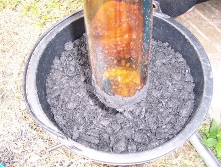 เตรียมถังกรองที่เจาะรูก้นถังแล้วรองด้วยผ้า หรือปุยฝ้ายหรือฟองน้ำ จากนั้นบรรจุขี้เถ้าให้เต็มและกดให้แน่น จึงเทน้ำลงไปให้เต็มถังและกรองจนกว่าน้ำจะซึมผ่านลงไปหมด เทน้ำลงไปในถังกรองให้เต็มอีก กรองต่อไปจนน้ำแห้ง น้ำขี้เถ้าที่ได้จากการกรองสองครั้งนี้จะเค็มพอดีสำหรับการก่อหม้อและปรุงแต่งน้ำย้อม เก็บน้ำขี้เถ้าในถังมีฝาปิดมิดชิด ห้ามเก็บในโอ่งดินเพราะน้ำเกลือจะซึมออก อาจเติมน้ำรอบที่ 3 อีก แต่น้ำขี้เถ้าที่ได้มีความเค็มไม่พอ เอาไว้เติมเป็นน้ำแรกในถังต่อไปได้ กากขี้เถ้าจืดแล้ว ทิ้งได้ในดินทั่วไป