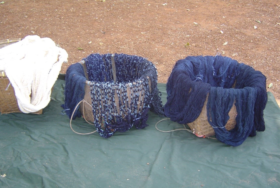 ซ้าย : น้ำย้อมคราม กลาง : ยกฝ้ายมัดหมี่ขึ้นจากน้ำย้อม ขวา : ฝ้ายมัดหมี่ย้อมคราม