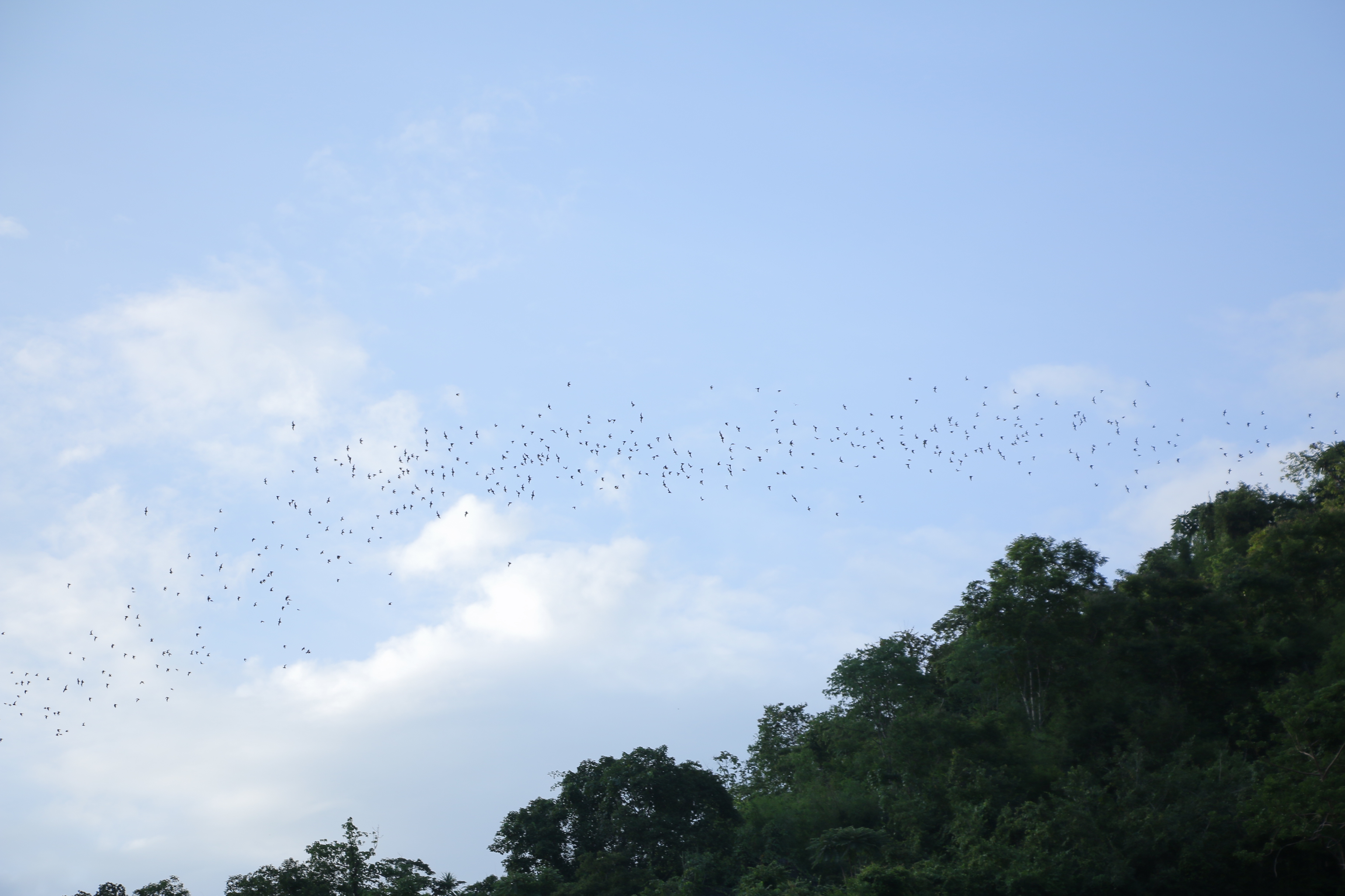 ในช่วงเวลาเย็นๆของทุกวัน เวลาประมาณ 5-6 โมงเย็น ค้างคาวปากย่น นับหลายแสนตัว จะทยอยบินออกจากถ้ำไปหากิน ดูเป็นรูปริ้วขบวนต่างๆ พลิ้วไหวไปมา