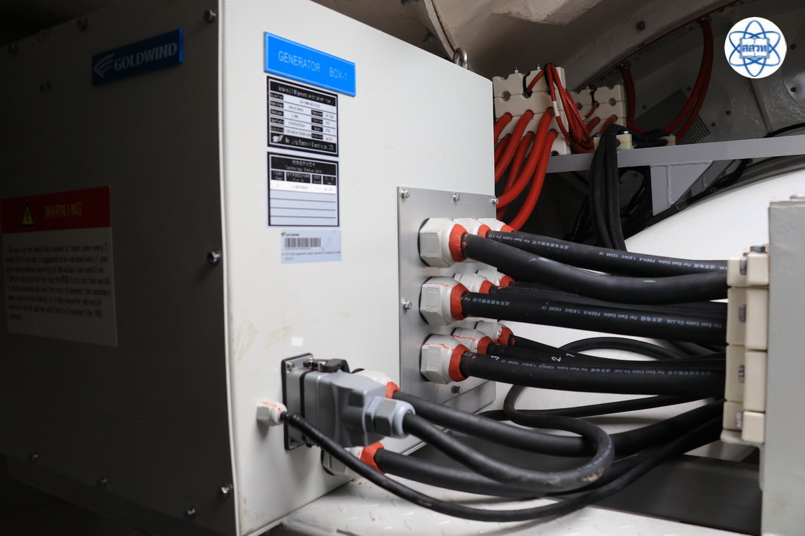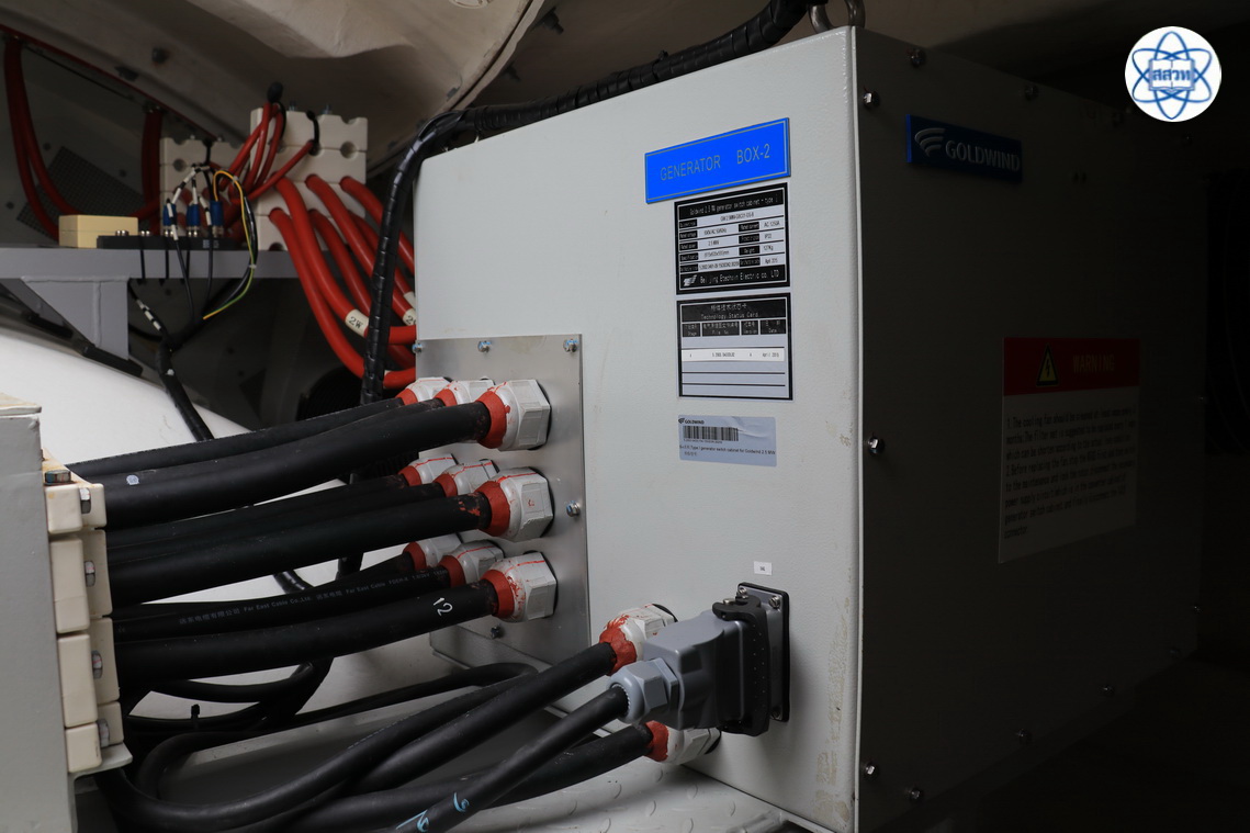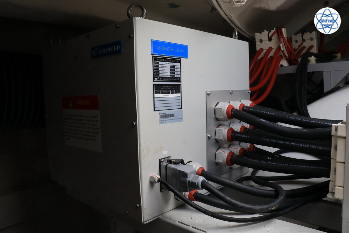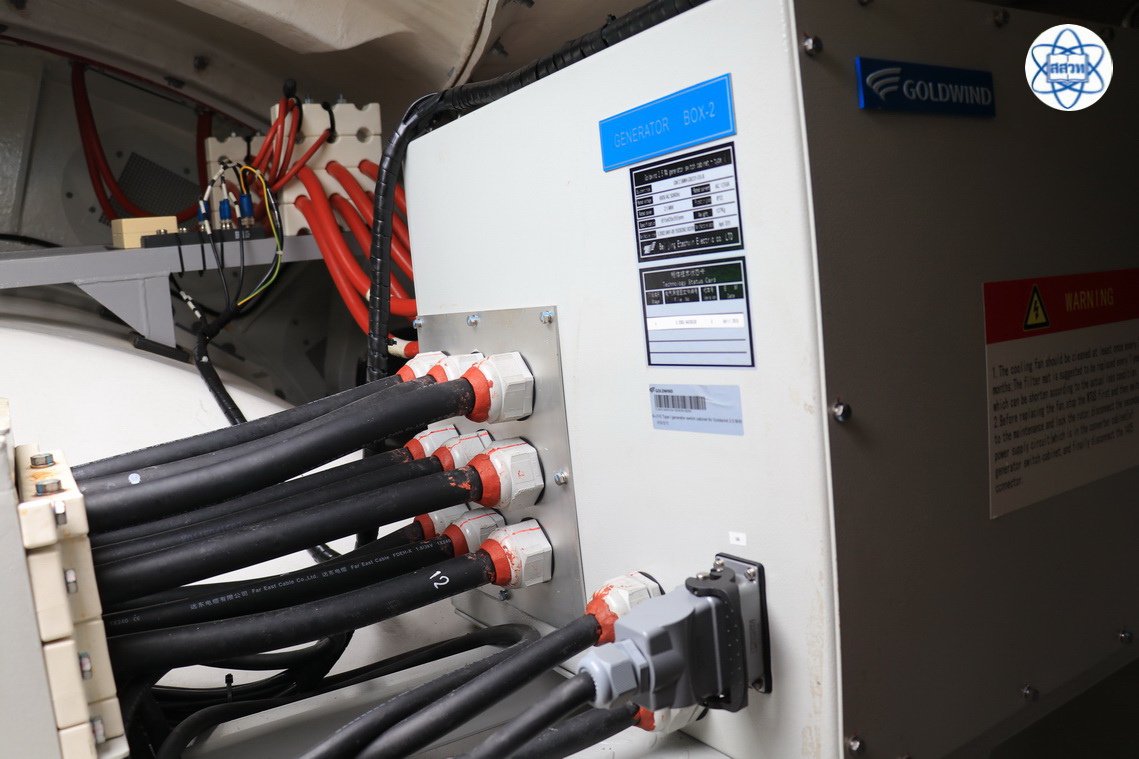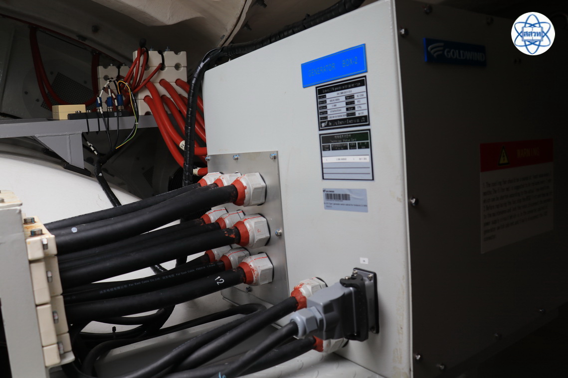 เพลาจากโรเตอร์ ต่อกับเครื่องกำเนิดไฟฟ้าโดยตรง และหมุนด้วยความเร็วเท่ากับใบพัด ในกรณีที่จะผลิตไฟฟ้าได้ โรเตอร์ที่ผลิตไฟฟ้า (เป็นรูปวงแหวน) ต้องมีเส้นผ่านศูนย์กลางที่มาก และแม่เหล็กที่ใช้เป็นแม่เหล็กที่ทำจากธาตุนีโอดิเมียม – Nb (แม่เหล็กแรเอิรธ์)